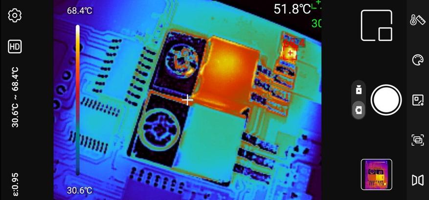 Интерфейс остался таким же интуитивным, как и в младших моделях. Основной экран занимает тепловое изображение с частотой обновления 25 кадров в секунду. В верхней части отображается текущий температурный диапазон кадра, внизу расположены основные элементы управления.