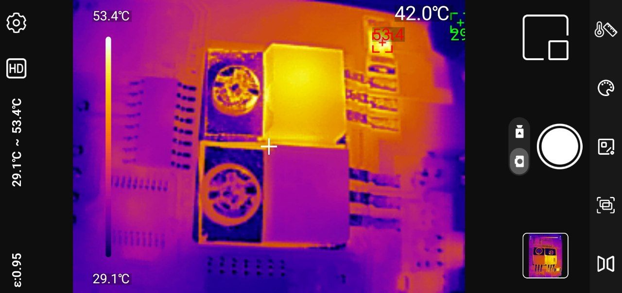 Матрица 256x192 пикселя в сочетании с ручной фокусировкой даёт изображение высокого качества с чёткими границами объектов и хорошей детализацией температурных градиентов. Программное обеспечение Thermal Mobile предоставляет весь необходимый функционал: от наложения оптического и теплового изображения до точечных измерений с настраиваемыми порогами. Стабильность работы, интуитивный интерфейс и широкие возможности настройки делают процесс диагностики комфортным. Рабочий температурный диапазон от -20°C до +450°C покрывает абсолютное большинство практических задач, а точность измерений +-2% в промышленном режиме соответствует профессиональным требованиям. Энергопотребление остаётся умеренным — смартфон не разряжается катастрофически быстро даже при продолжительной работе.