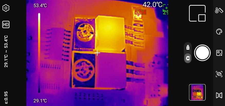 Цветовые палитры: Доступно несколько схем отображения тепловой информации — Rainbow HC, Lava, Black Hot, White Hot, Rainbow и Iron. Каждая палитра оптимальна для определённых задач: Rainbow HC хорошо показывает мелкие температурные градиенты, Black Hot удобен для работы с горячими объектами на холодном фоне, а Iron даёт классическое представление тепловой картины.