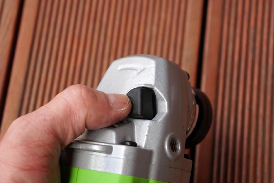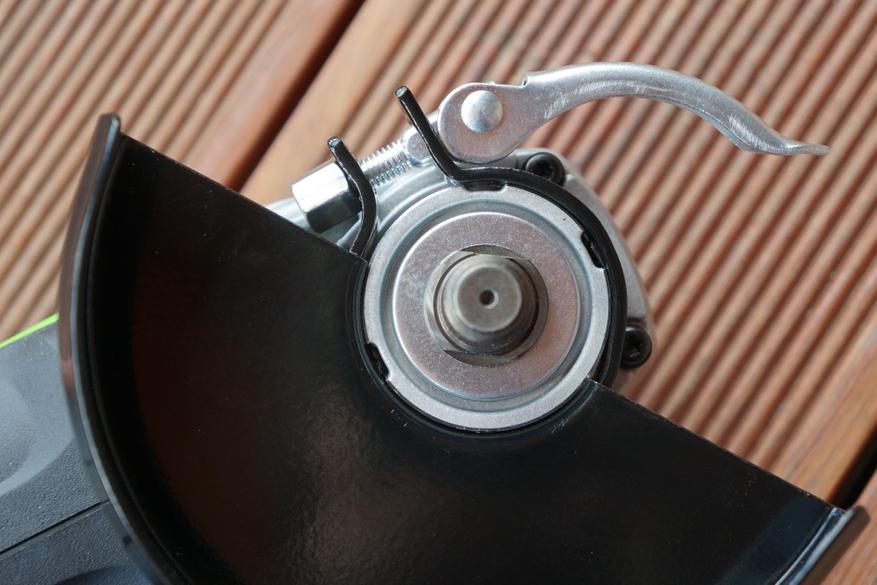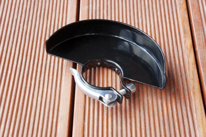 Защитный кожух оснащен защелкой для возможности быстрой перестановки в нужное положение. На корпусе инструмента и кожухе есть совмещаемые элементы для четкой фиксации защиты в нескольких положениях, в зависимости от того как проводится работа. Правильно установленный кожух держится на шпинделе крепко, без люфта.