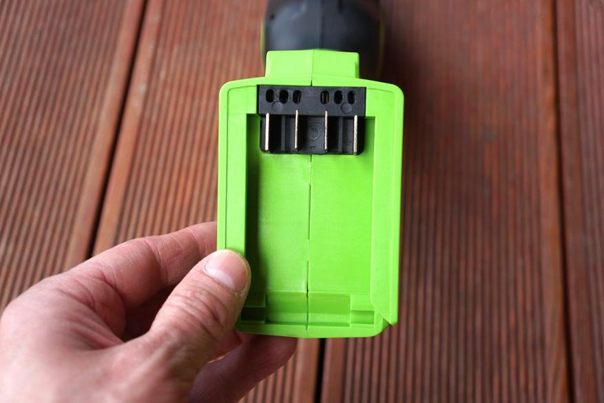 Комплектное зарядное устройство на один аккумулятор выдает 2А. Оснащено съемным кабелем питания. На задней стороне есть отверстия для возможности крепления ЗУ на стене в вертикальном положении.