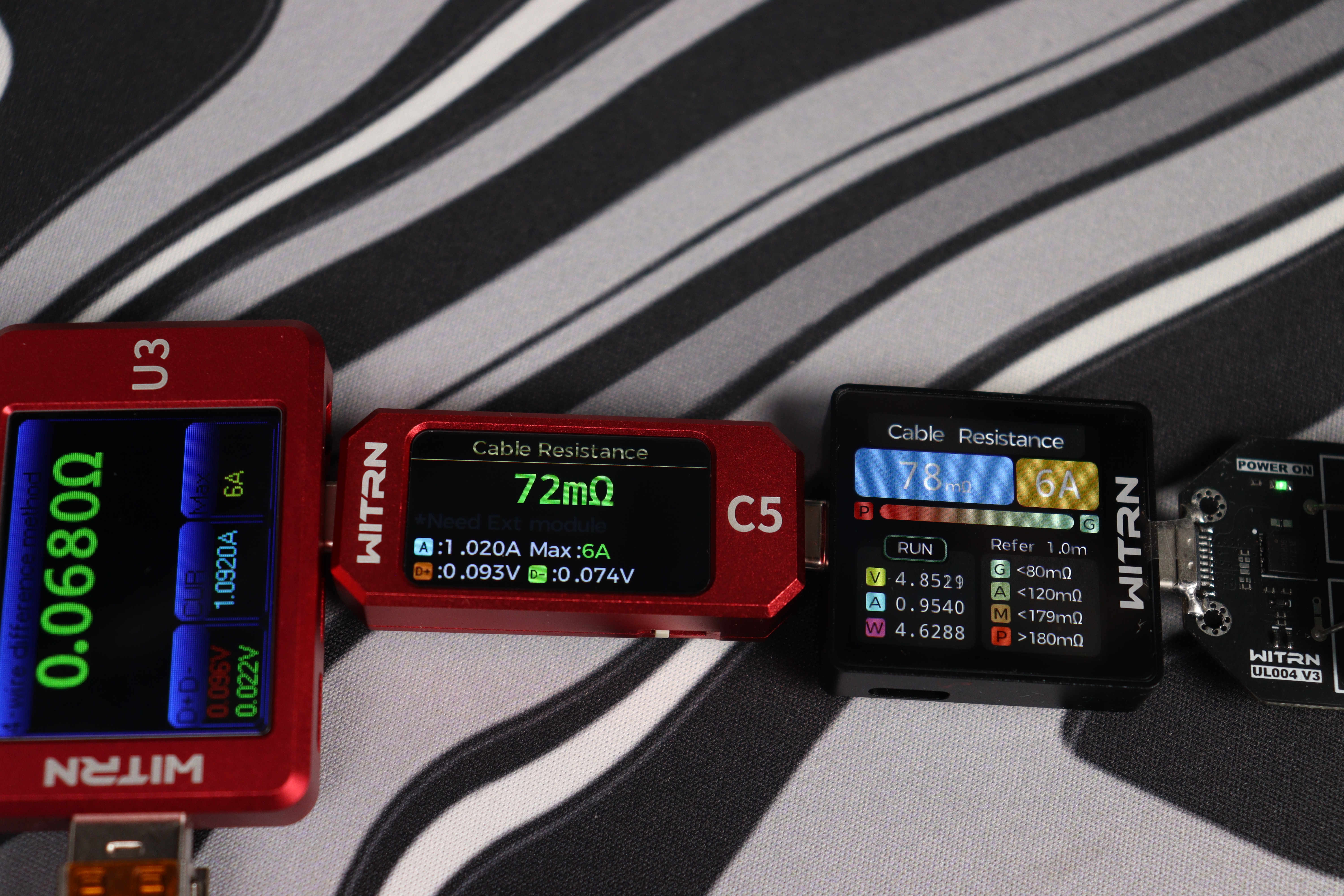Дополнительно можно измерить внутреннее сопротивление проводника как через встроенные средства тестера, так и при помощи внешнего нагрузочного модуля (например, как в моем случае, с помощью нагрузки WITRN UL004).