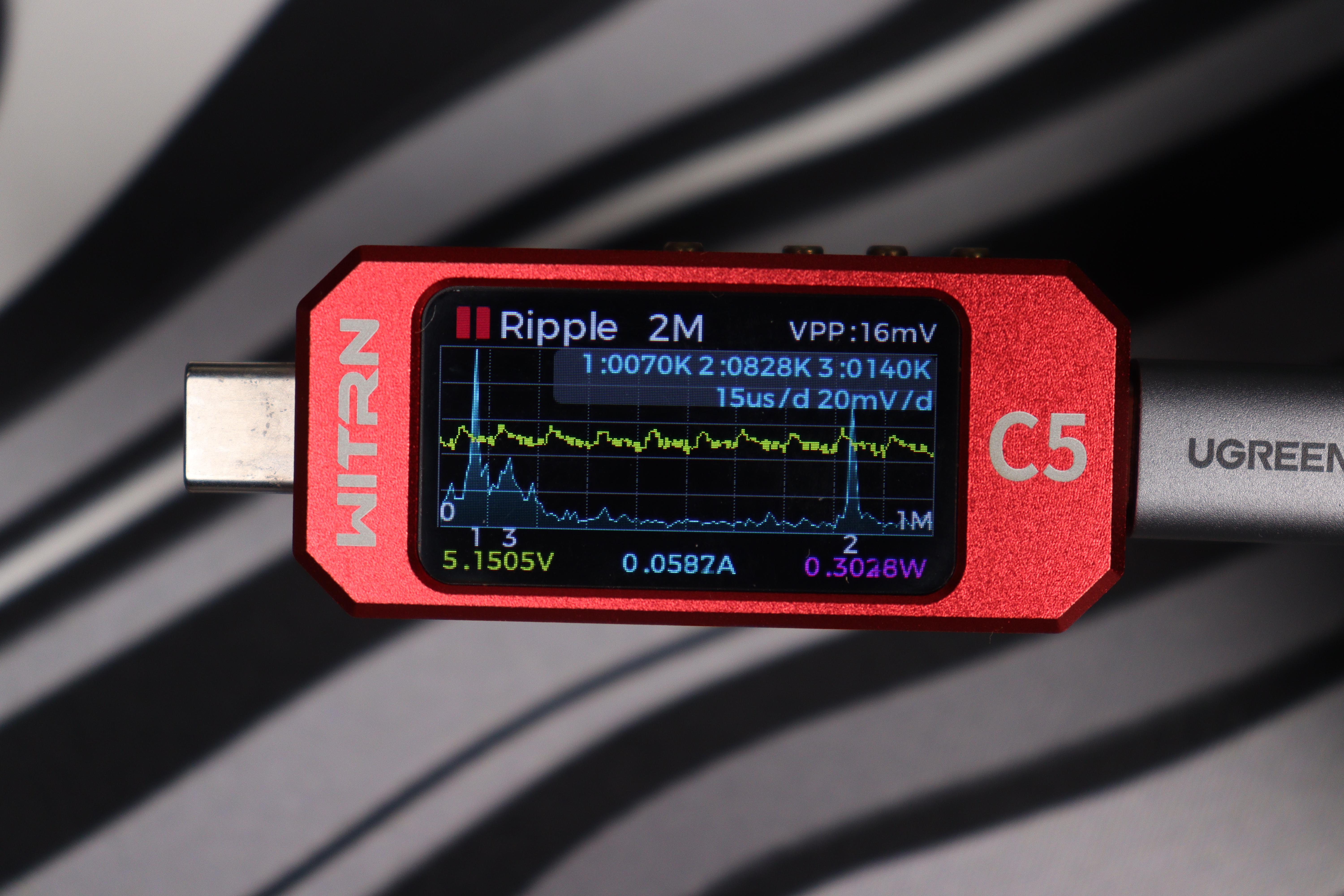 Финальный функциональный экран предоставляет режим графического отображения данных, включая осциллографические возможности. Тестер оснащен функцией, трансформирующей портативный USB-анализатор в серьезный измерительный прибор с полосой пропускания 2 МГц и автоматическим спектральным анализом пульсаций на трех частотных точках. Это позволяет профессионально оценивать качество блоков питания и обнаруживать электромагнитные наводки в режиме реального времени. Тем не менее, ограниченная полоса пропускания может быть недостаточной для исследования современных высокочастотных импульсных источников питания, а миниатюрный дисплей существенно усложняет детальный анализ осциллограмм и точные измерения временных характеристик, что уменьшает его применимость в действительно профессиональных задачах по сравнению с полноразмерными лабораторными осциллографами. В подменю доступен выбор графиков для линий данных D+/D-, напряжения и тока.