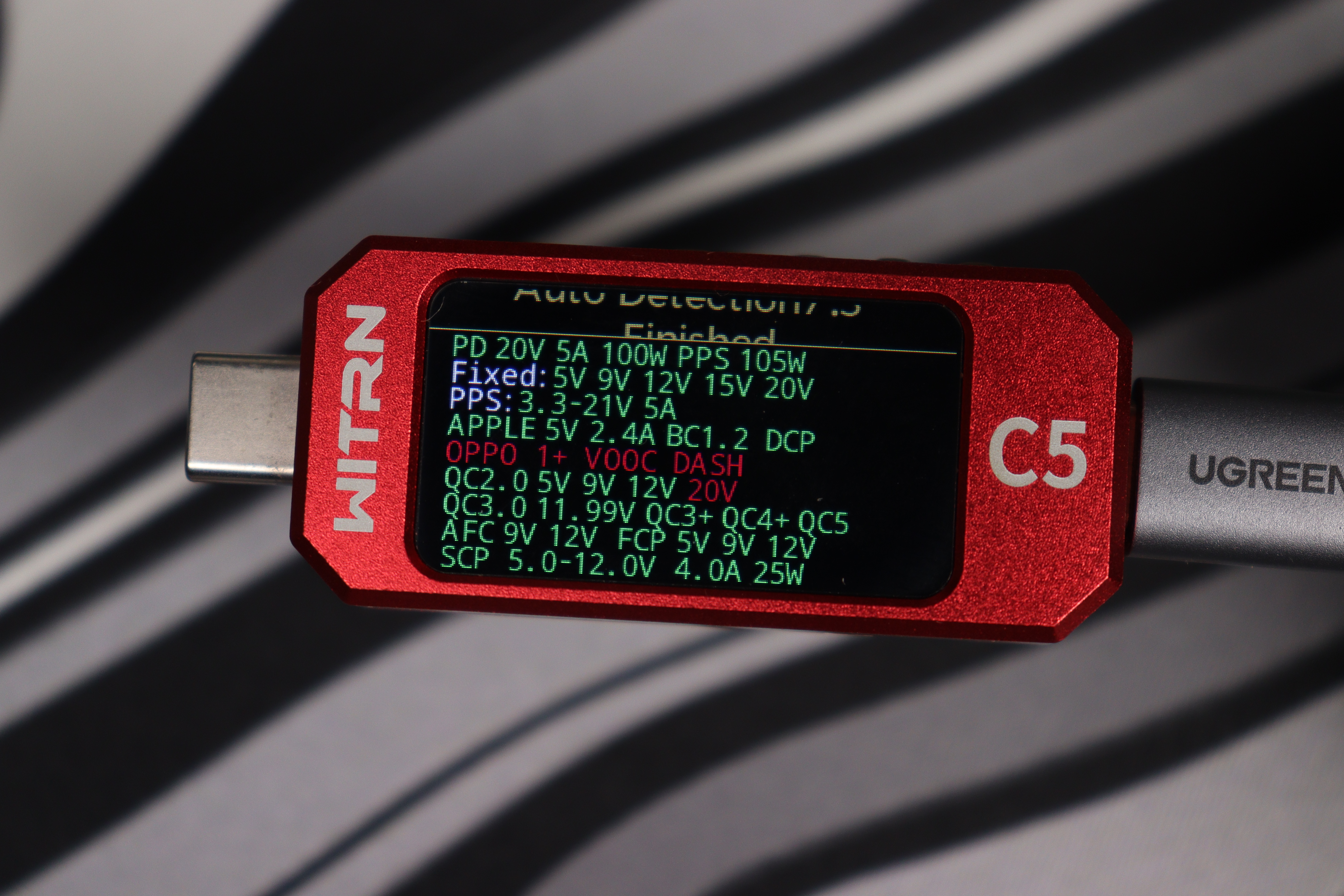 Дисплей показывает уровни напряжения на информационных линиях D+ и D-, что дает возможность определить активный протокол ускоренной зарядки. Устройство способно распознавать и инициализировать широкий спектр зарядных протоколов: QC1.0, QC2.0, QC3.0, QC3+, QC4.0, QC4+, QC5, AFC, FCP, SCP, Apple, PD3.0, PD3.1, MTK, PPS, VOOC, Super VOOC. В настройках доступен режим автоматического определения протоколов либо возможность принудительного выбора требуемого стандарта зарядки.