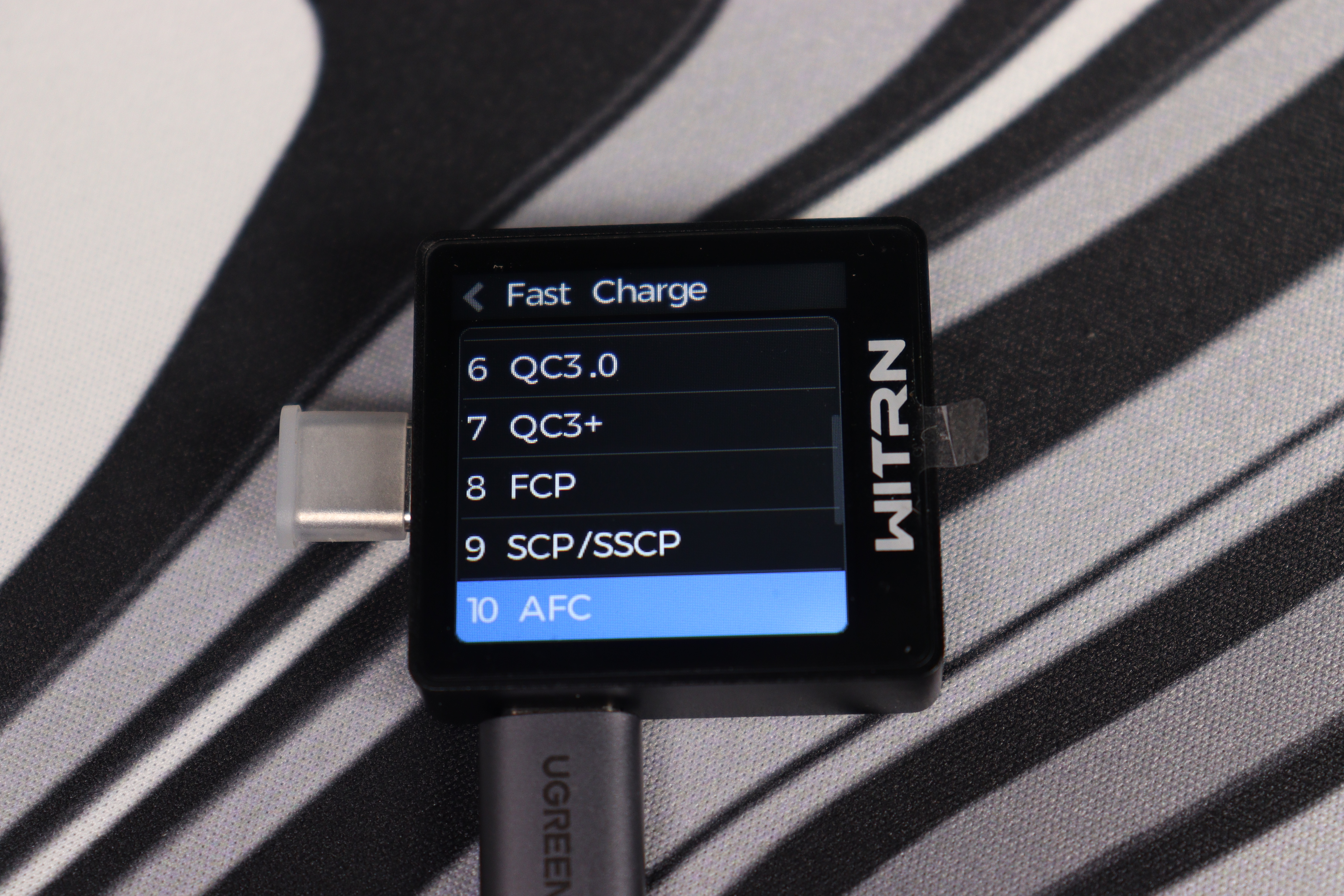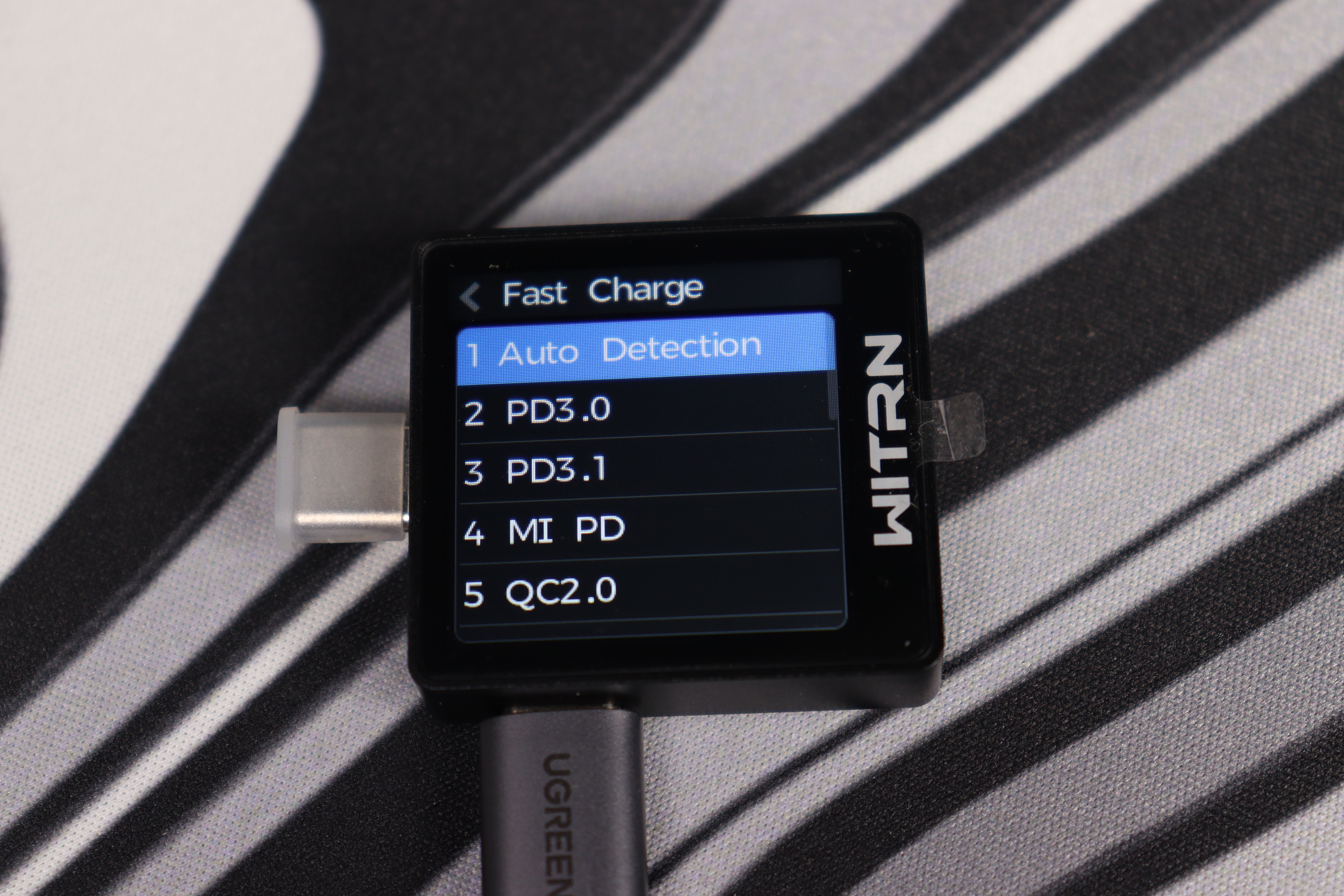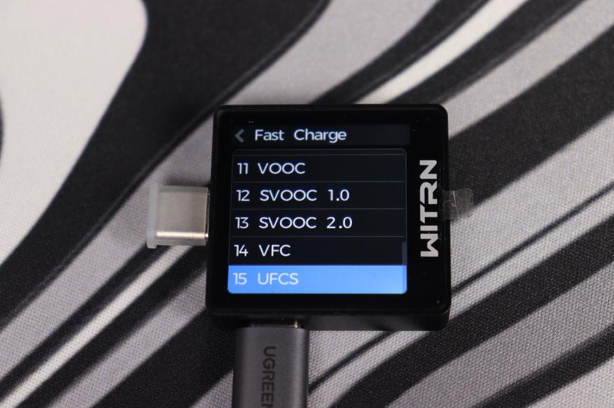 Четвёртый экран WITRN K2 объединяет сразу несколько ключевых возможностей, которые делают этот тестер универсальным инструментом. В первую очередь, здесь реализована поддержка различных протоколов быстрой зарядки. Устройство может определять наличие и параметры таких стандартов, как QC (включая QC4 и QC5), PD (вплоть до PD 3.1), VOOC, SCP, AFC и другие. Информация отображается в виде уровней напряжения на линиях D+ и D-, а также по Power Delivery — с указанием доступных профилей мощности. В этом же разделе можно вручную выбрать нужный протокол для активации или запустить автоматическое определение. Правда, на текущем этапе прошивки автоопределение работает не всегда корректно — некоторые адаптеры и кабели не распознаются или распознаются неправильно. Но учитывая частые обновления прошивок от WITRN, скорее всего, эта проблема будет решена в ближайшее время.