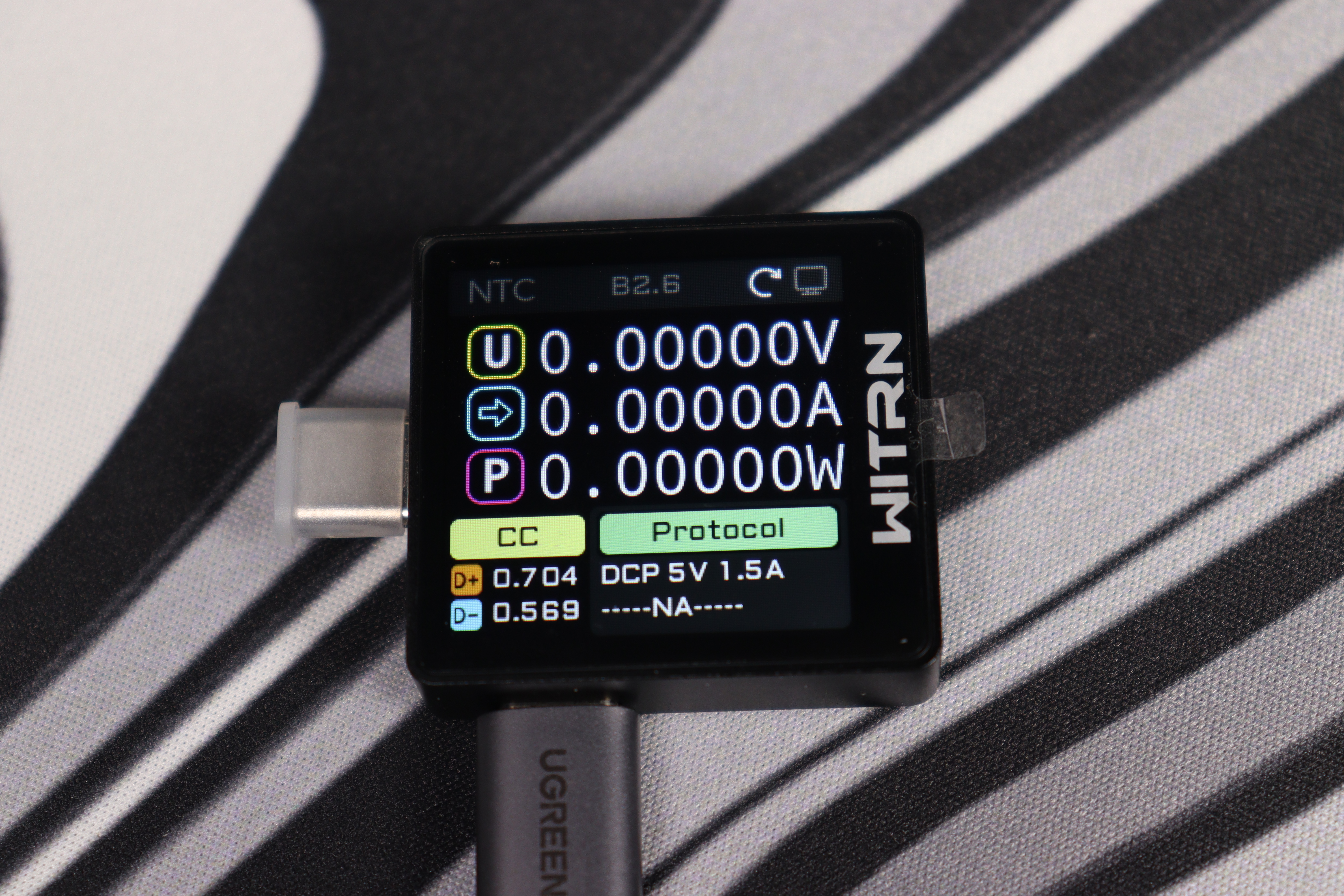 Как и у предыдущих моделей, начальный экран показывает напряжение, ток и мощность. Всё отображается чётко и с высокой точностью. Подойдёт для быстрой диагностики любого источника питания. Картинка очень контрастная и сразу видны все основные необходимые показатели. Дополнительно отображается напряжение на линиях D+- и используемый протокол быстрой зарядки.