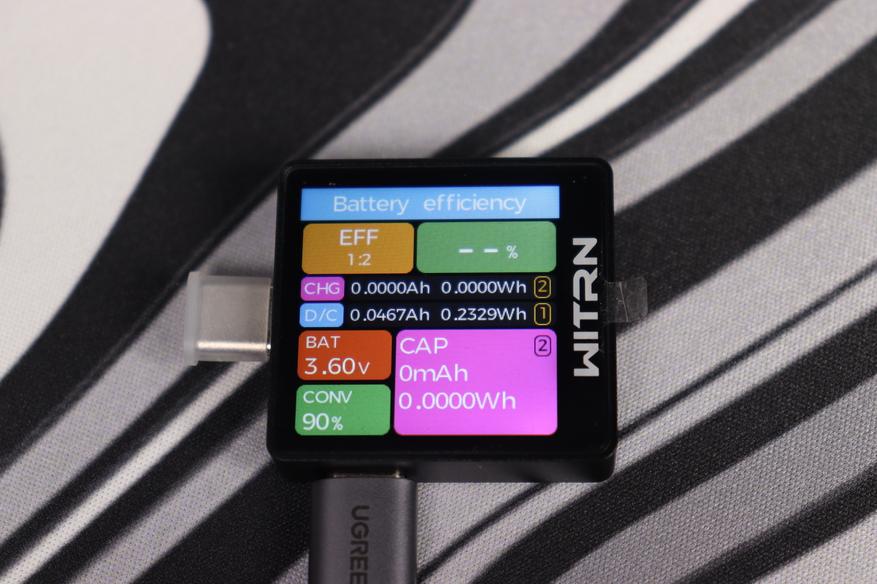 Оценить также можно эффективность аккумулятора: он показывает, сколько энергии поступило при зарядке (CHG) и было отдано при разрядке (D/C), рассчитывает КПД (CONV) и позволяет понять реальную ёмкость батареи (CAP). Здесь также отображается текущее напряжение аккумулятора (BAT) и можно наглядно оценить потери энергии при цикле заряд-разряд — полезная функция для тестирования powerbank'ов, литий-ионных ячеек и аккумуляторов с заявленной ёмкостью.