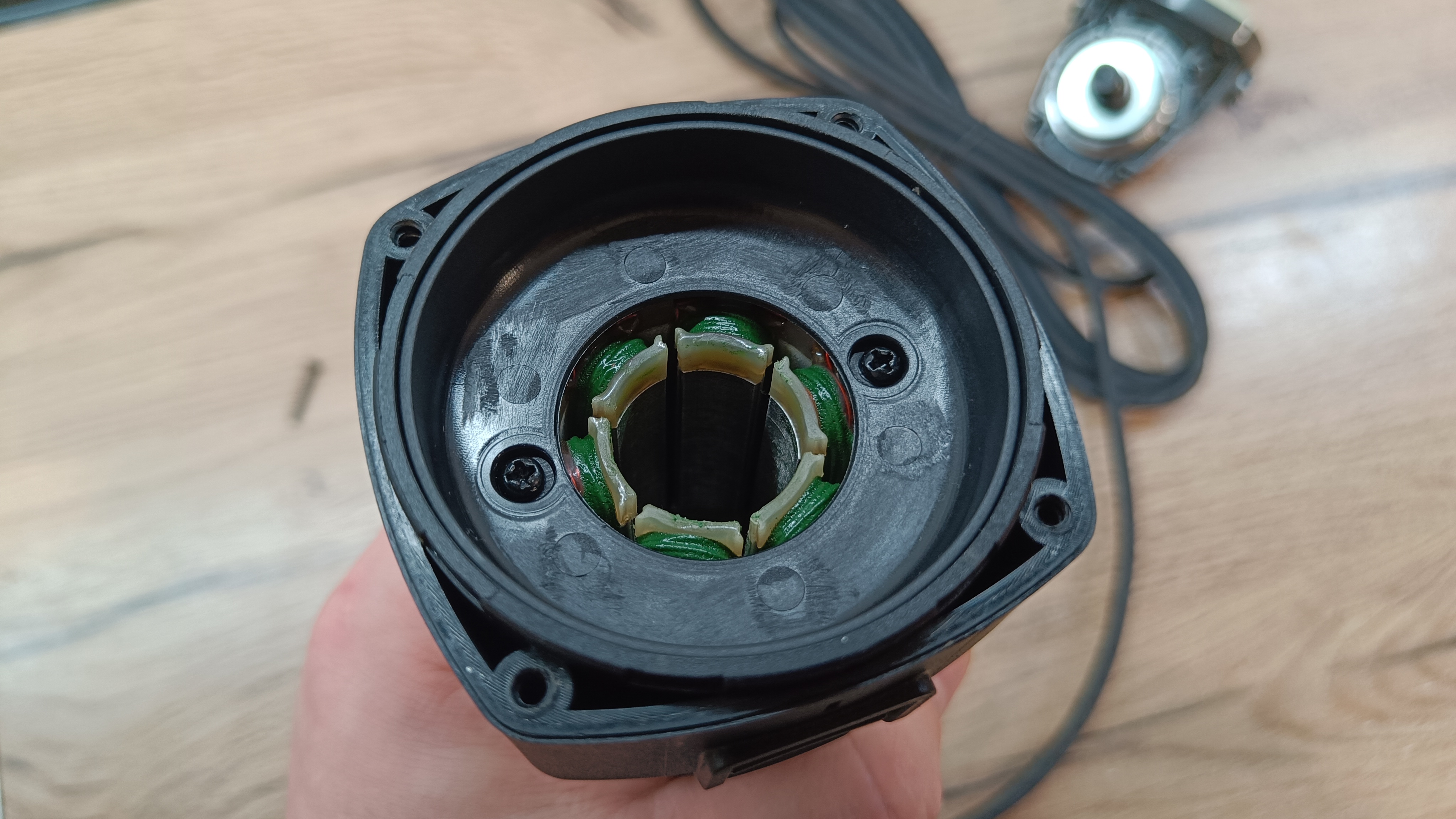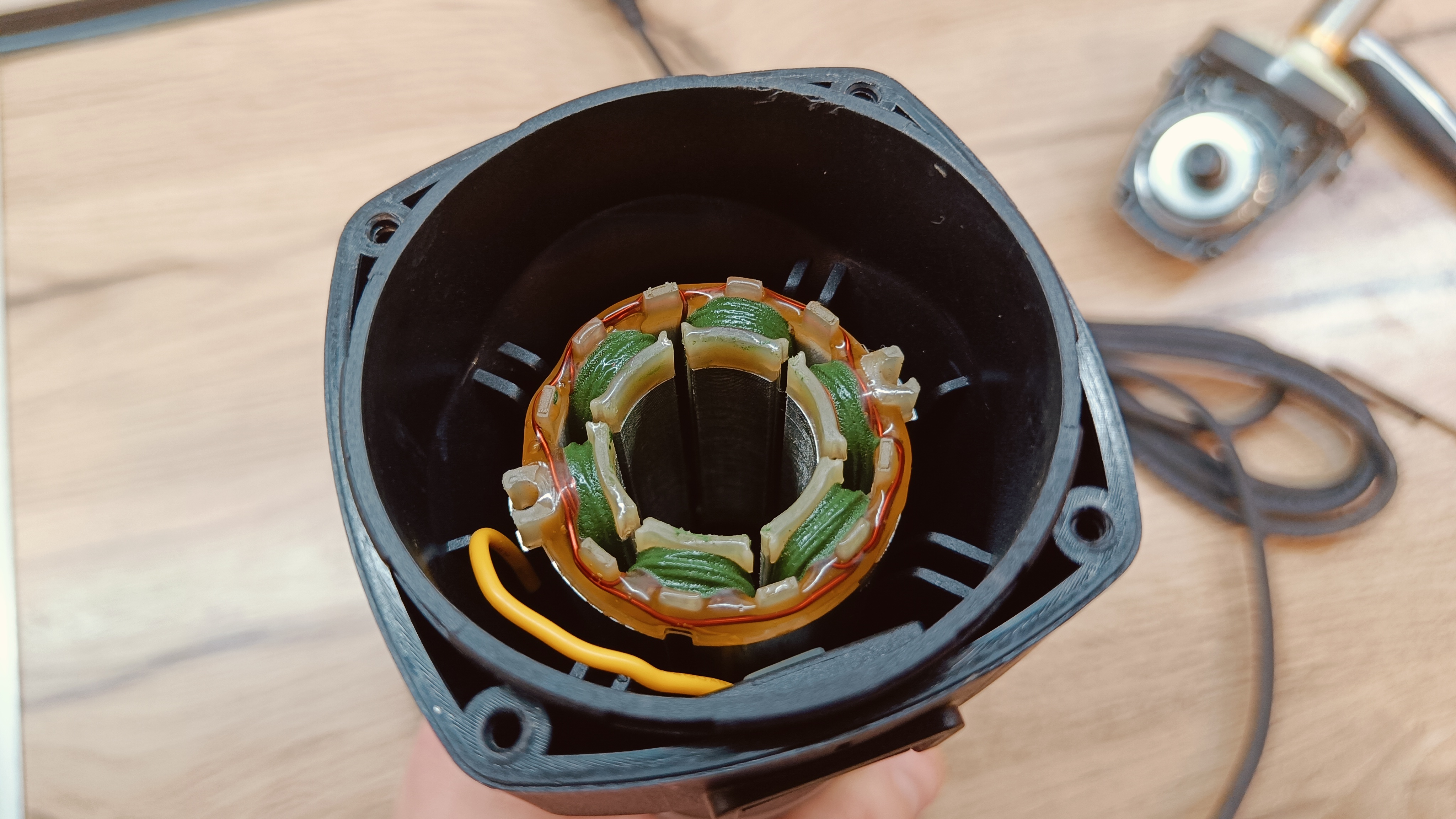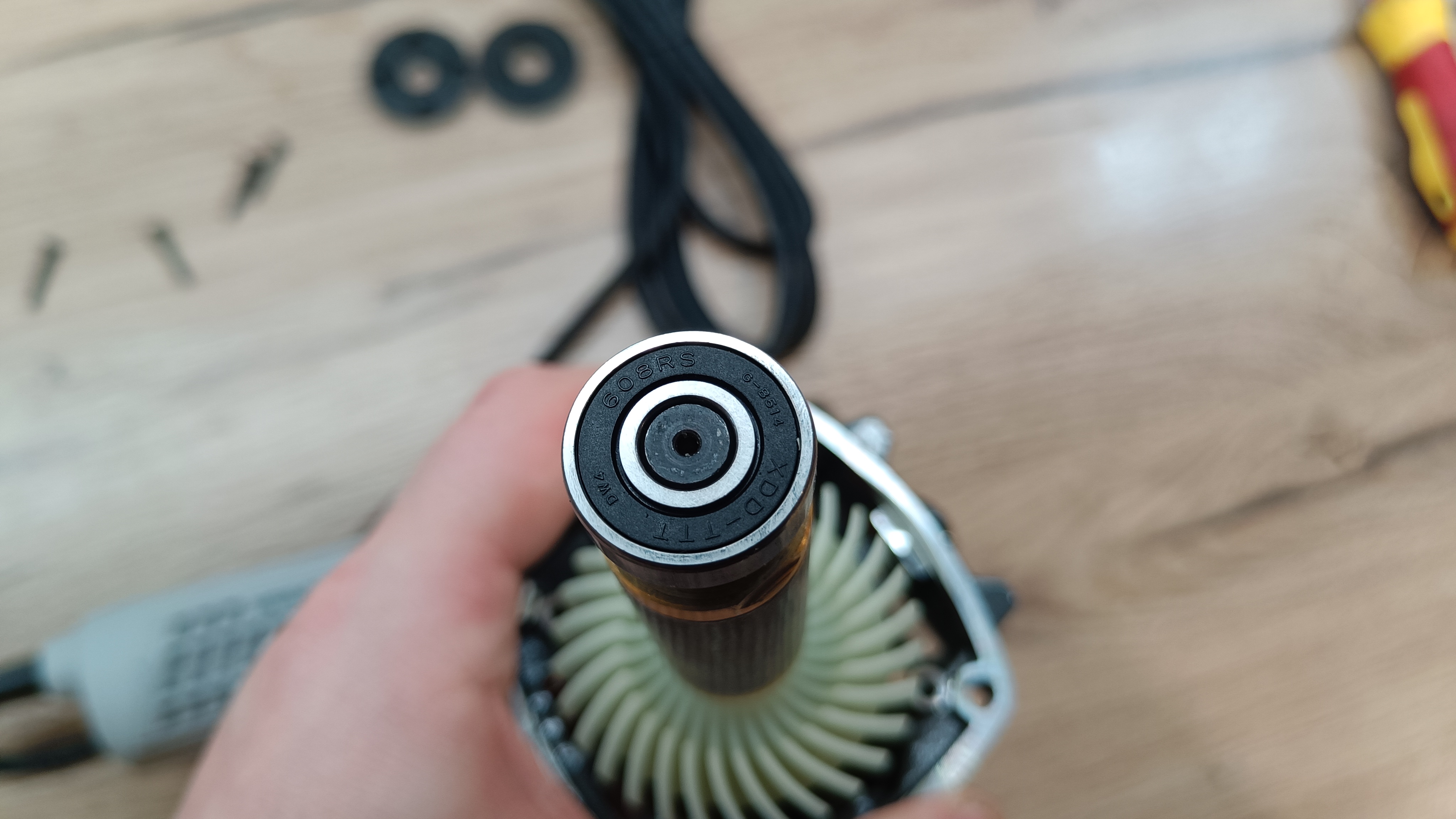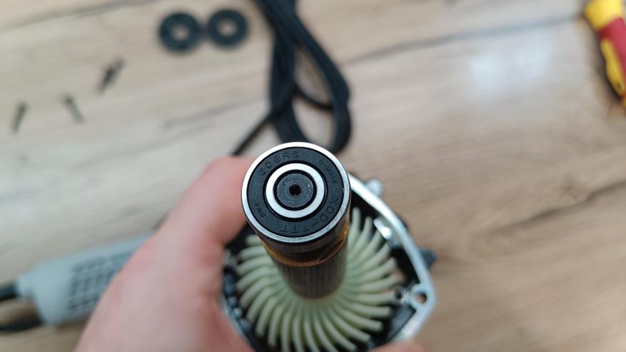 Обмотки двигателя прикрыты пластиковой накладкой. Обмотки статора облиты компаундом, что защищает от случайных трений с металлической стружкой. Двигатель и правда бесщеточный, есть следы балансировки. Большая пластиковая крыльчатка создает мощный поток воздуха для охлаждения. Опорный подшипник 608RS.