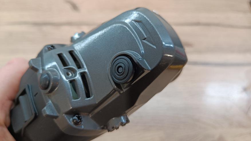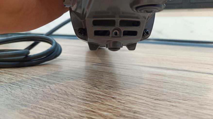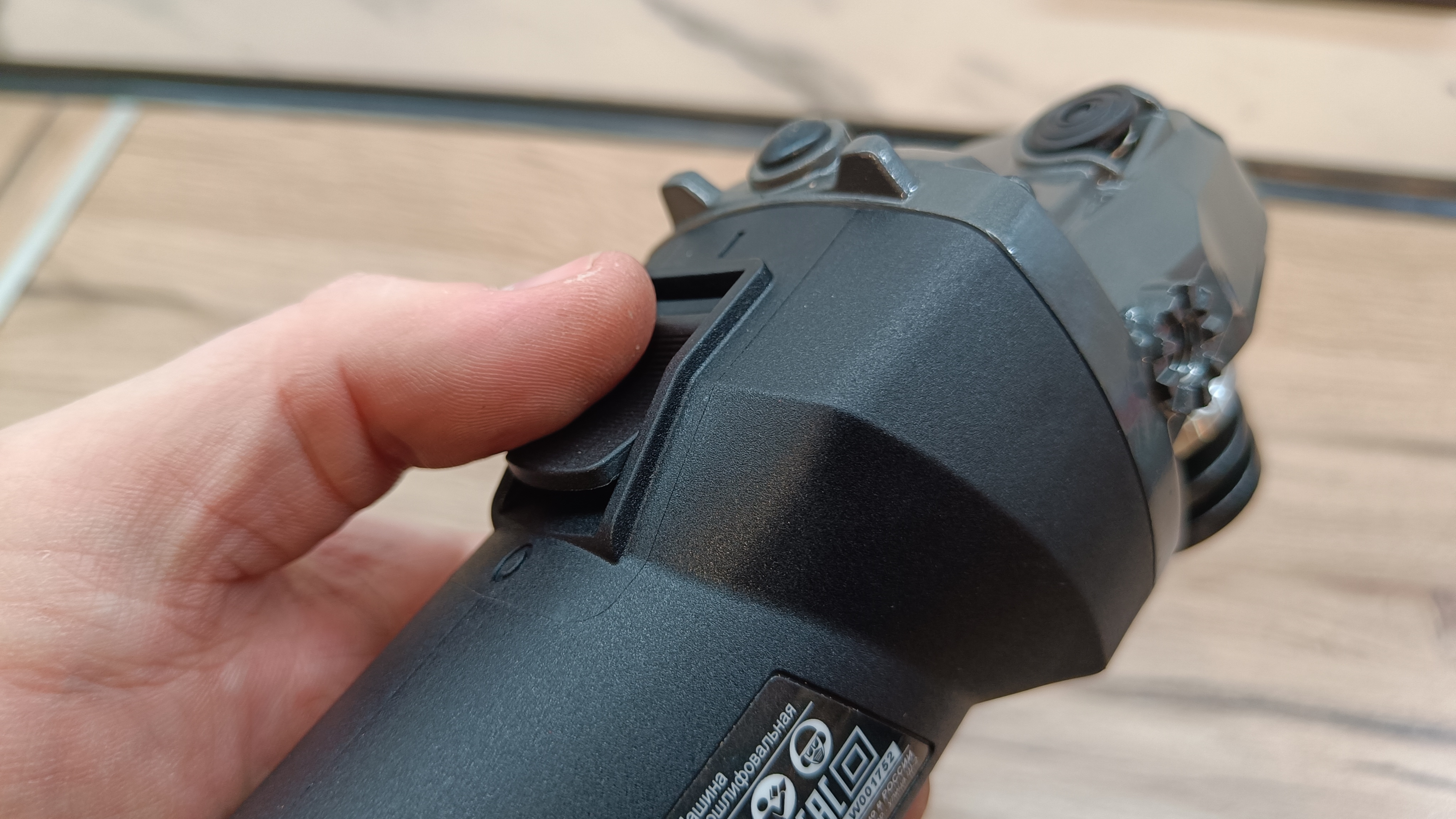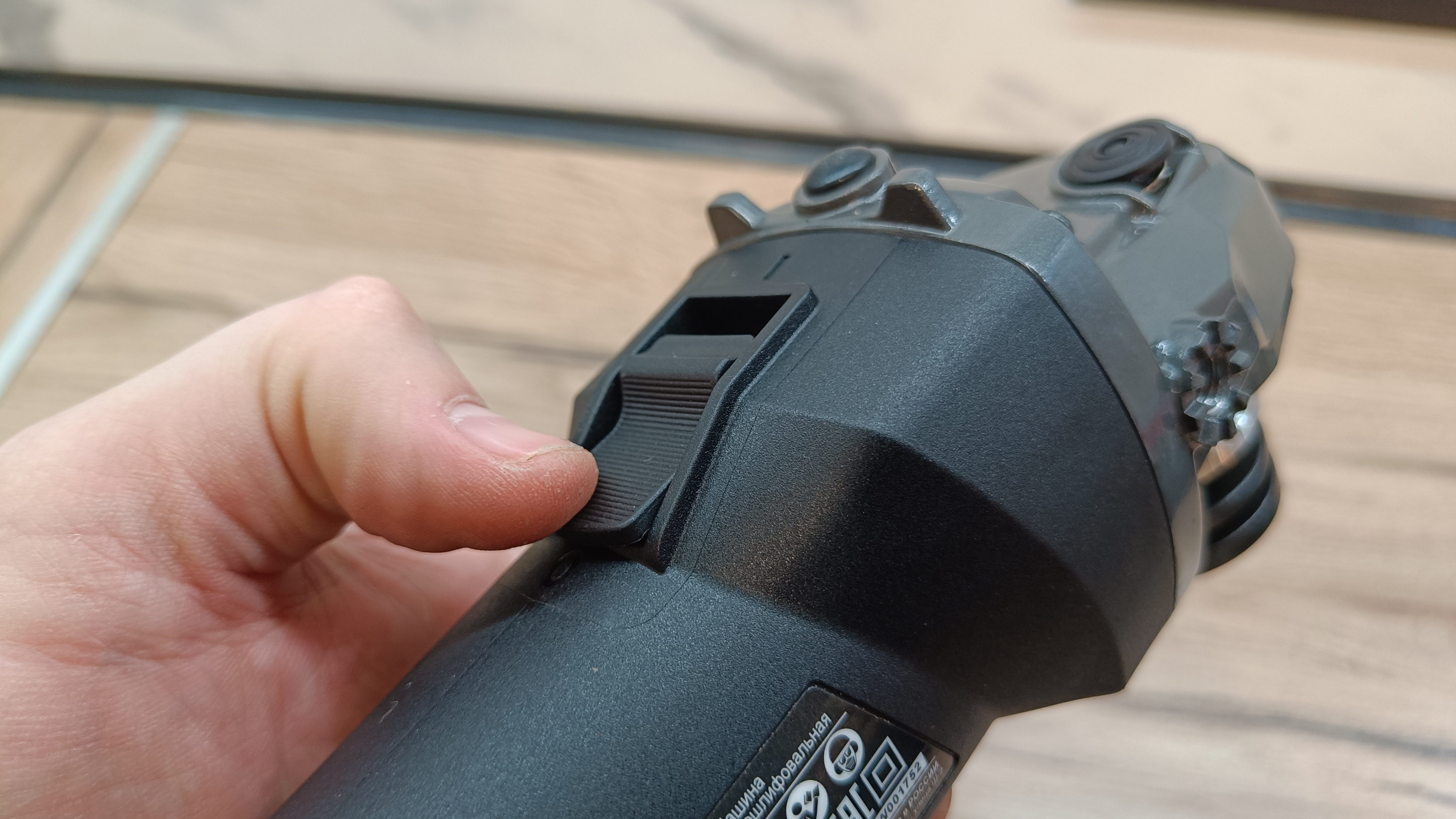 Кнопка включения сдвижная с фиксатором. Включается с небольшим усилием, а чтобы выключить потребуется лишь нажать на хвостик кнопки. С тыльной стороны есть опорные ножки на редукторе и резиновый демпфер, препятствующий скольжению.
