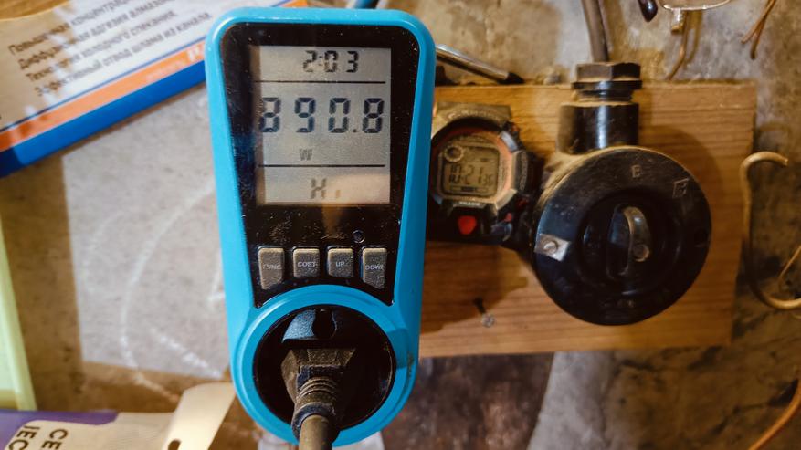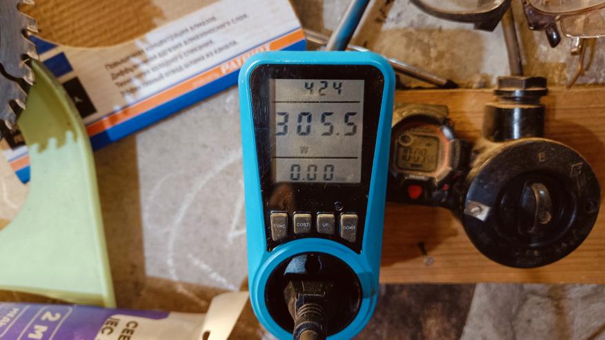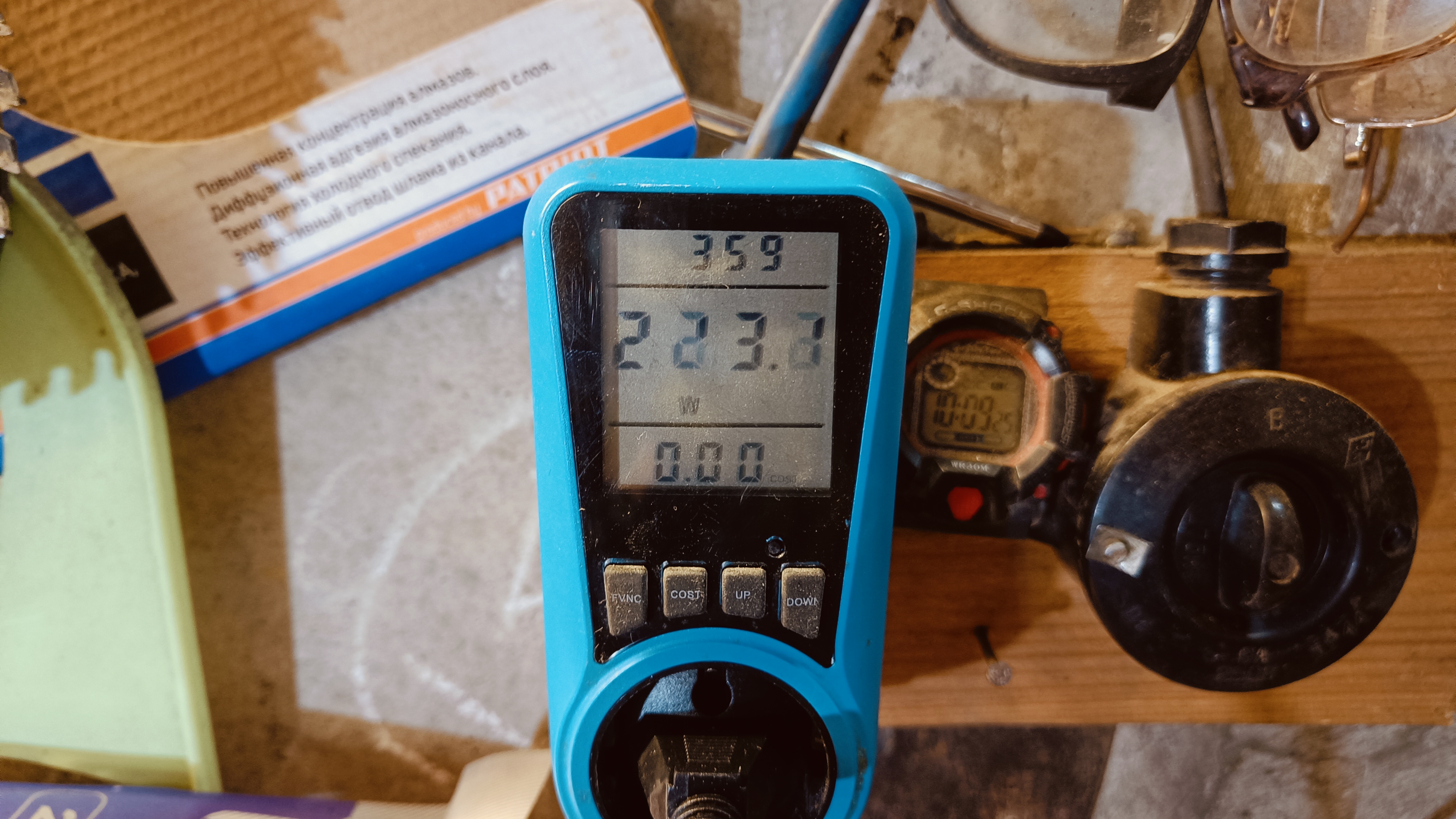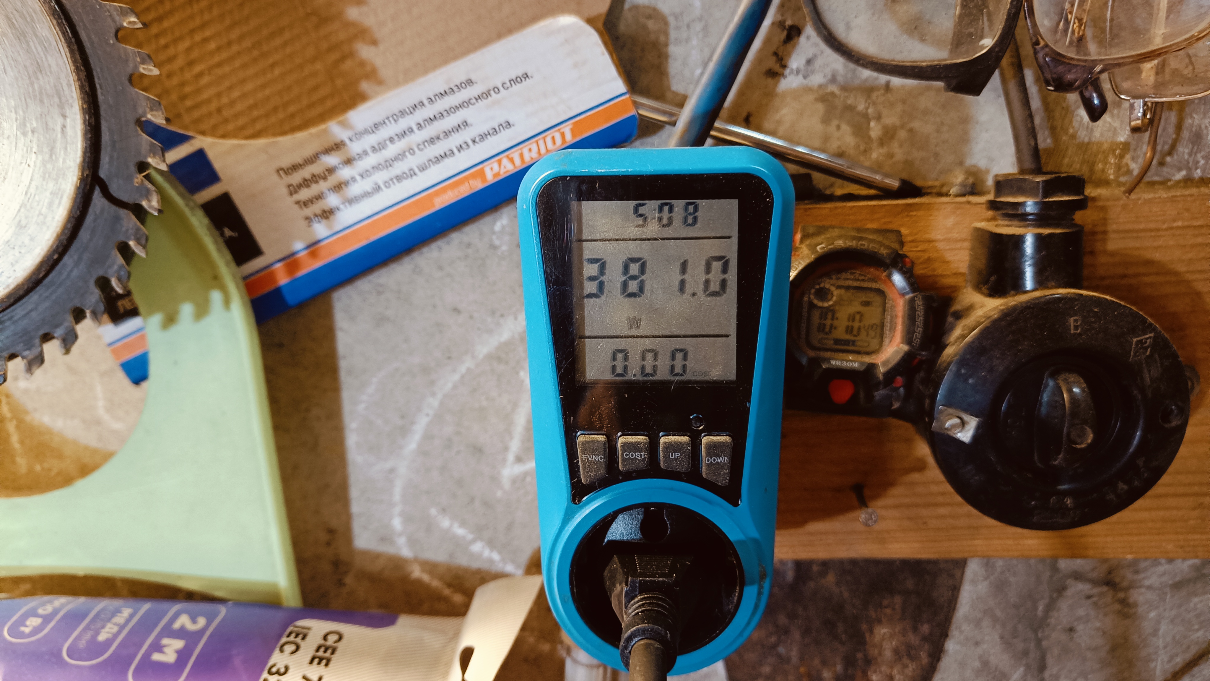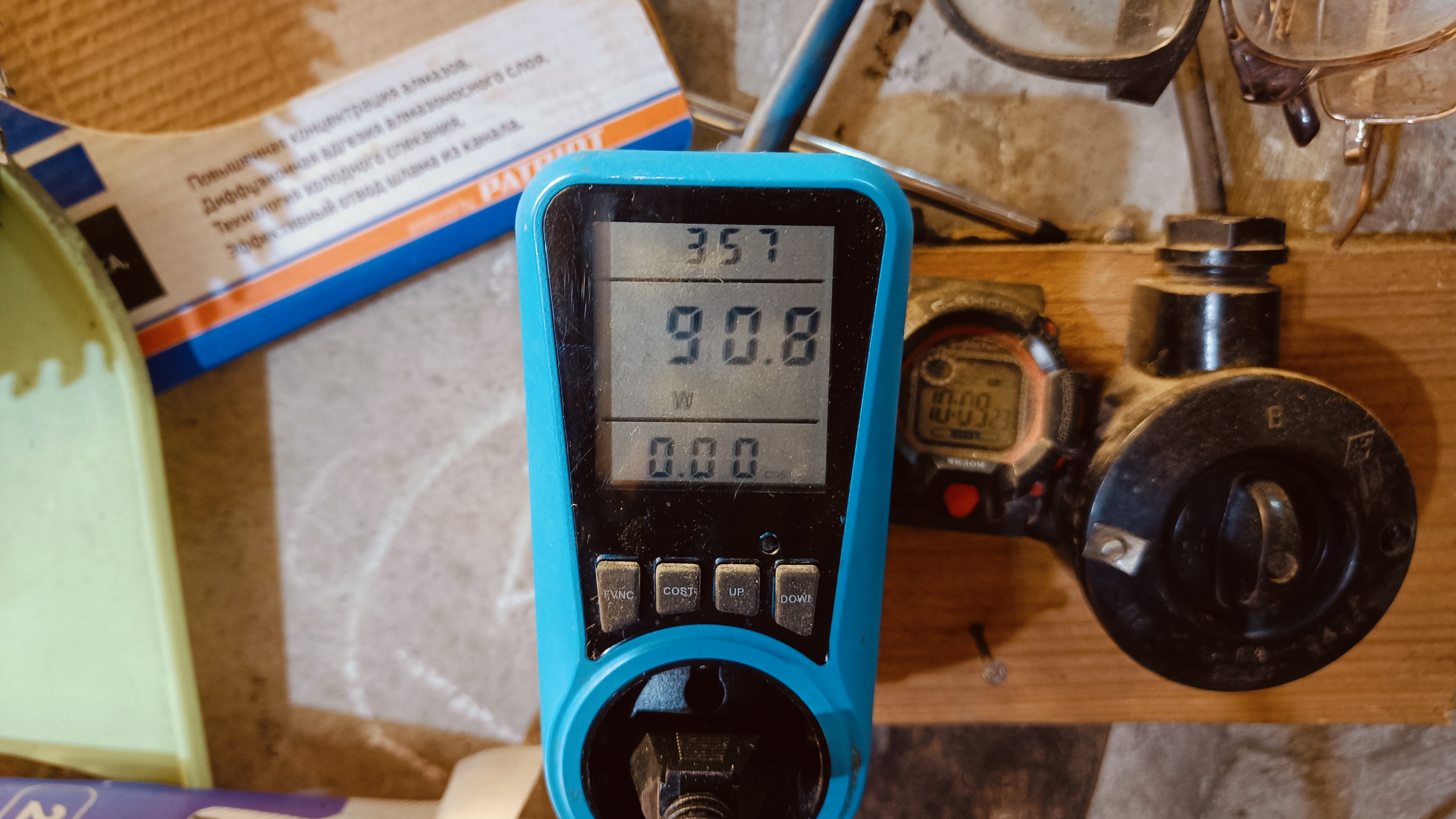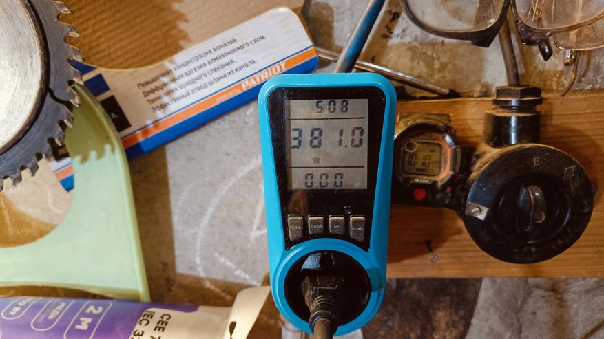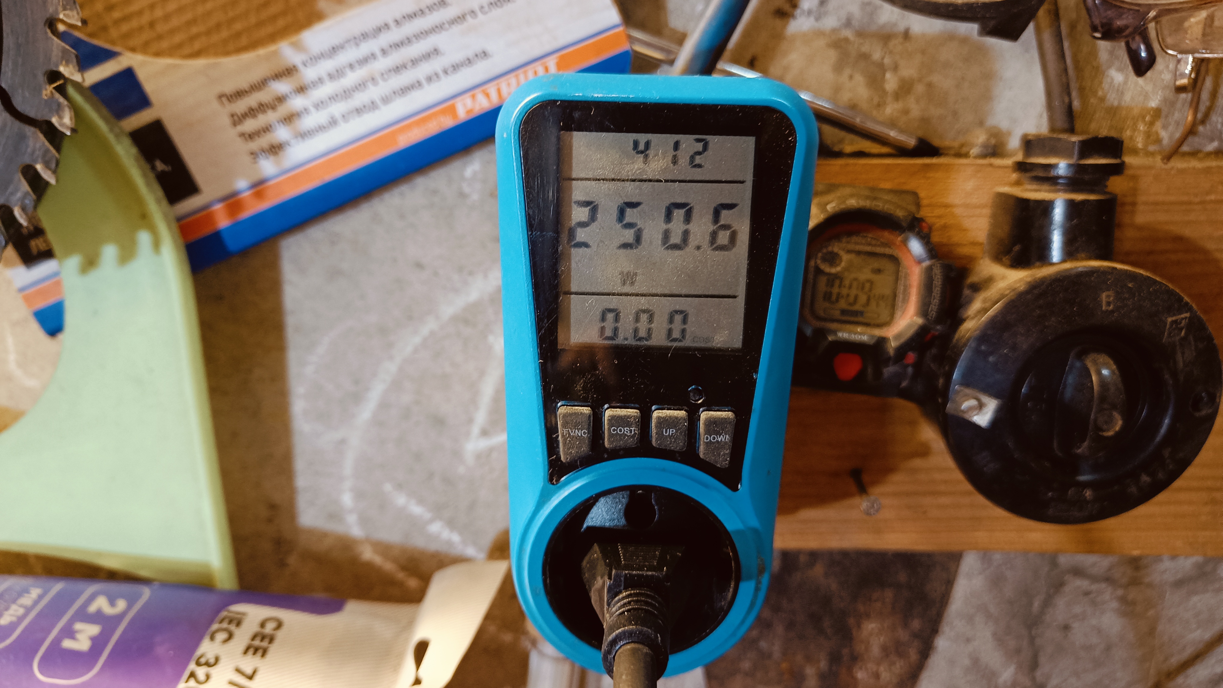 Замерил потребляемую мощность на различных настройках скорости вращения от 1 до 6 деления. Ваттметр показал от 90 до 381 Вт на холостом ходе без нагрузки.