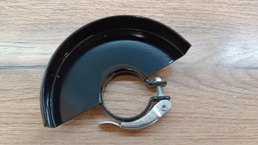 Защитный кожух из листового окрашенного металла. Толщина достигает 1.5 мм. Установка за счет быстросъемного крепления, что позволяет пользователю изменить положение защиты. Обычно производители оснащают свой инструмент кожухами с фиксацией за счет винтового соединения. В этом случае требуется фигурная отвертка и больше времени.
