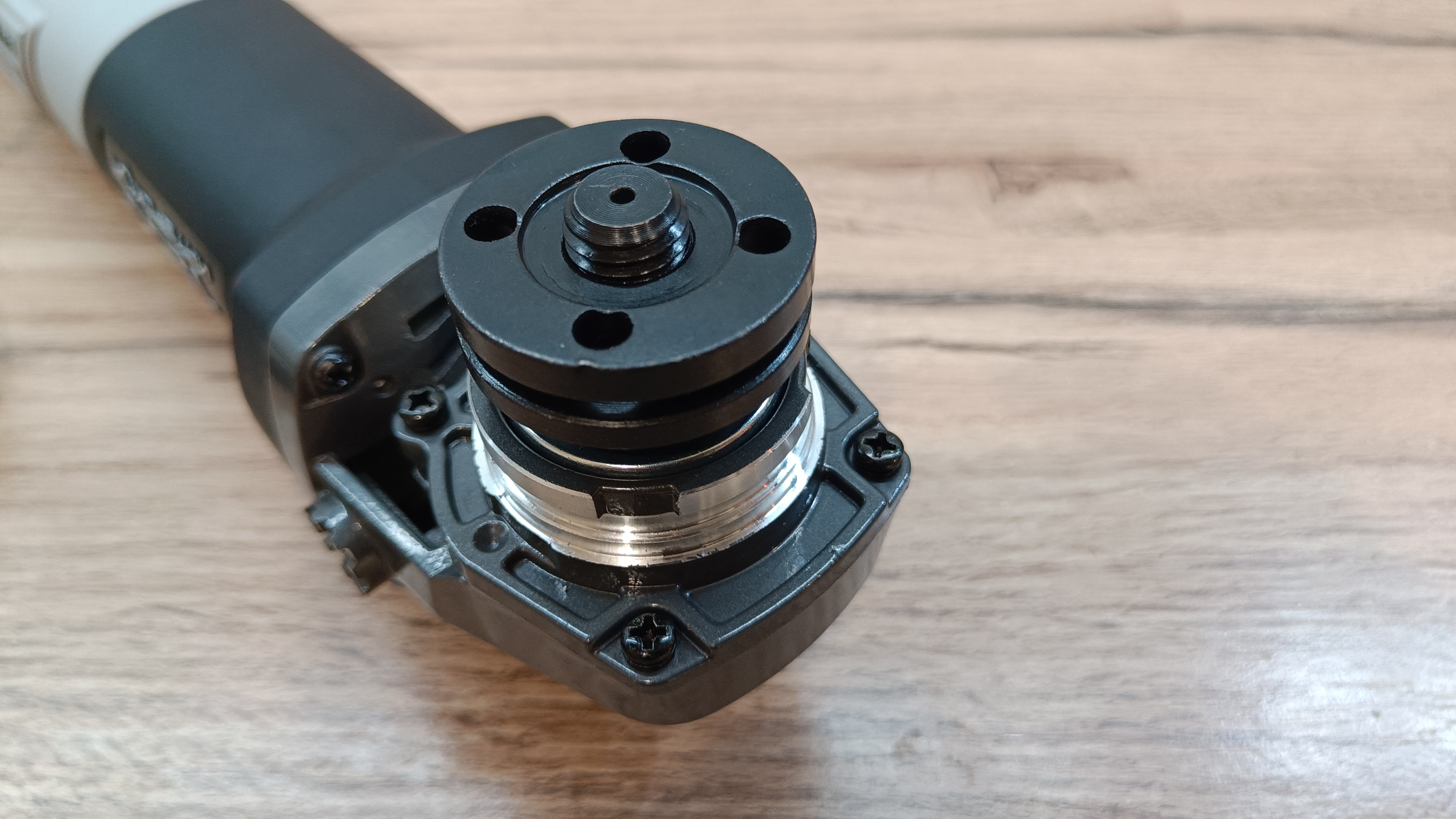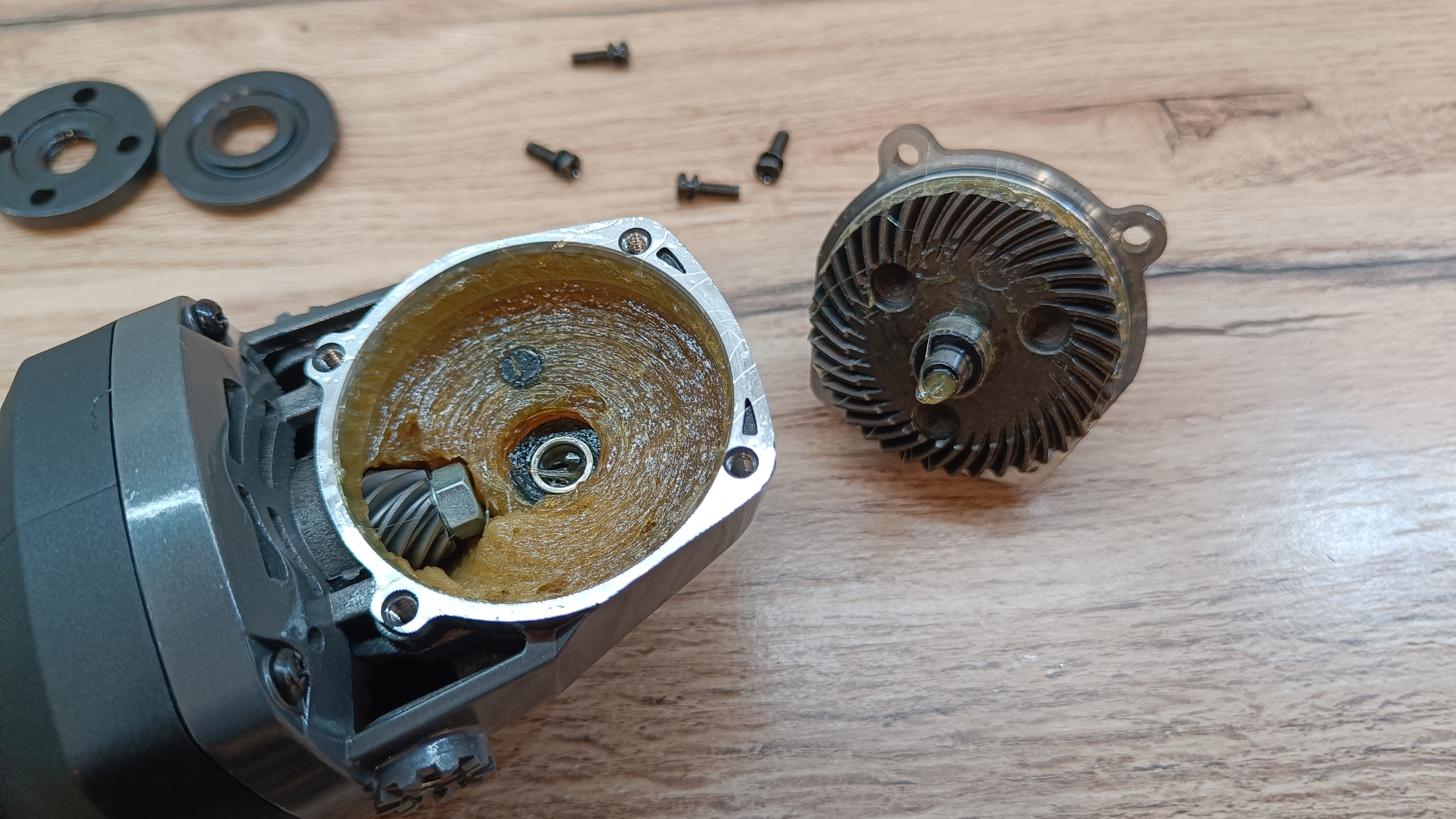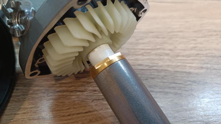 Начнем с редуктора. Для длительной безаварийной работы требуется необходимое количество смазки, которой тут не пожалели. В дальнейшем, возможно, потребуется ее добавить после обкатки. Крышка косозубой шестерни плотно установлена в корпусе редуктора. Сразу же обращаем внимание, что сам шпиндель на закрытом подшипнике.