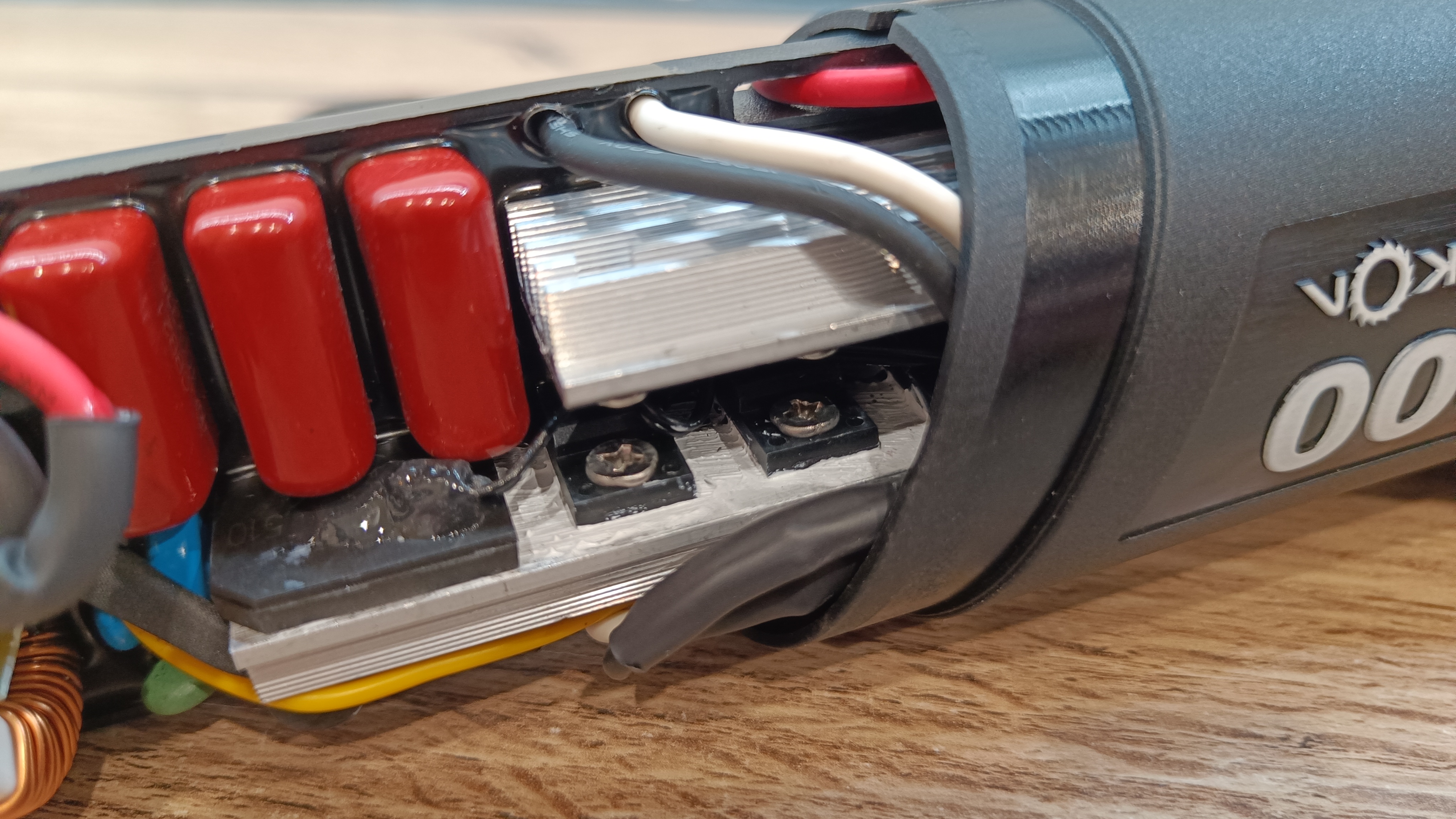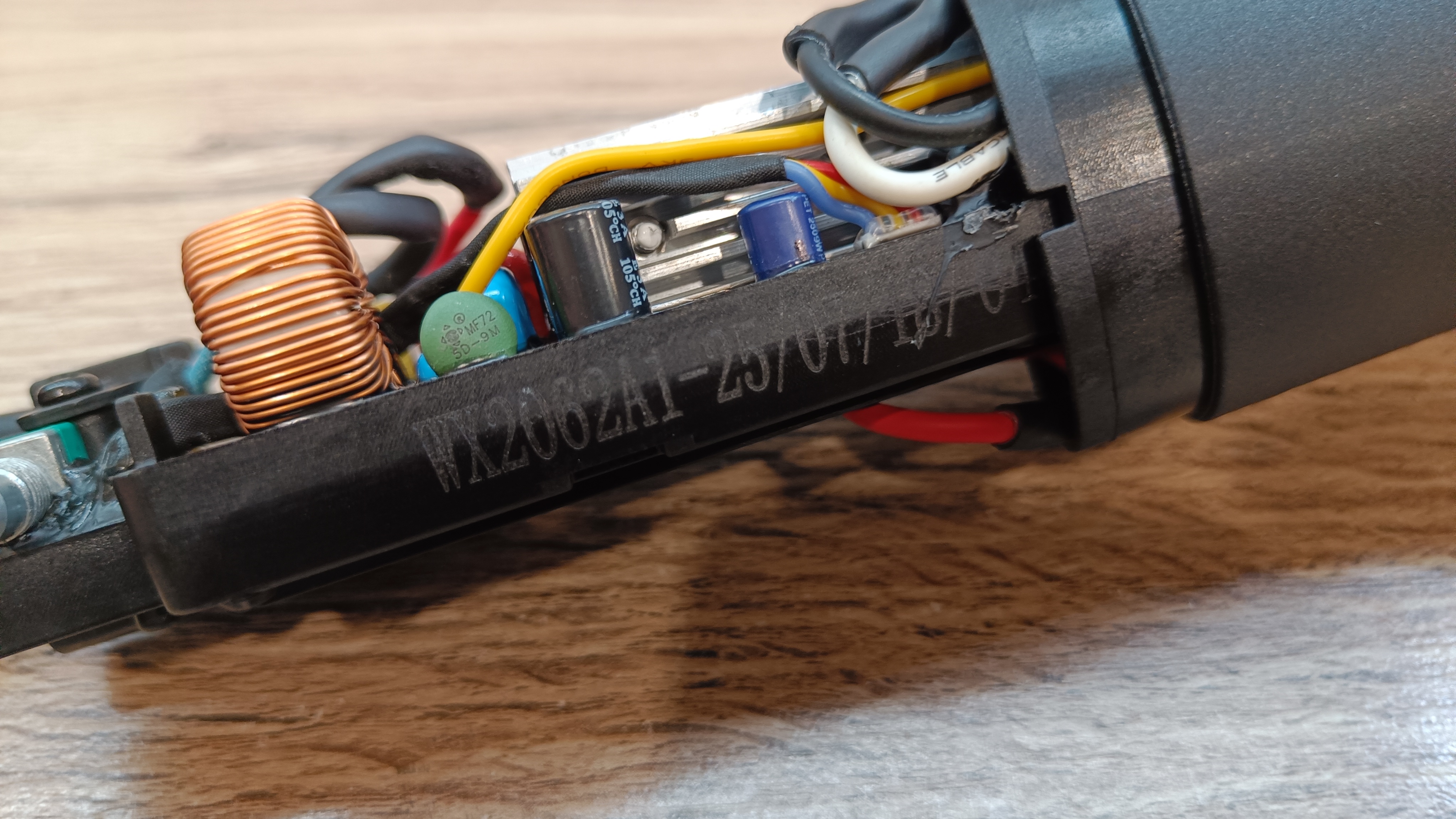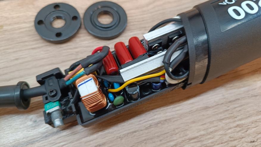 Смотрим электронику. Для этого придется снять защитный кожух в нижней части инструмента. Большие алюминиевые радиаторы для охлаждения силовых транзисторов, контроллер управления вращением БК двигателя. Схемотехника аккуратная, с дополнительной изоляцией и с пусковым конденсатором.