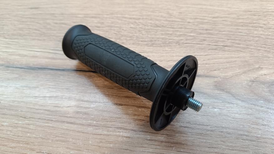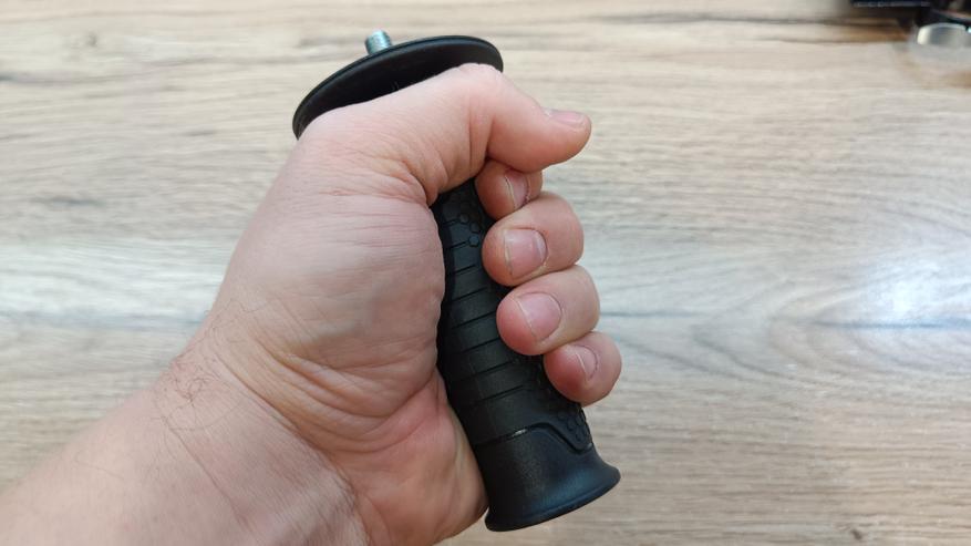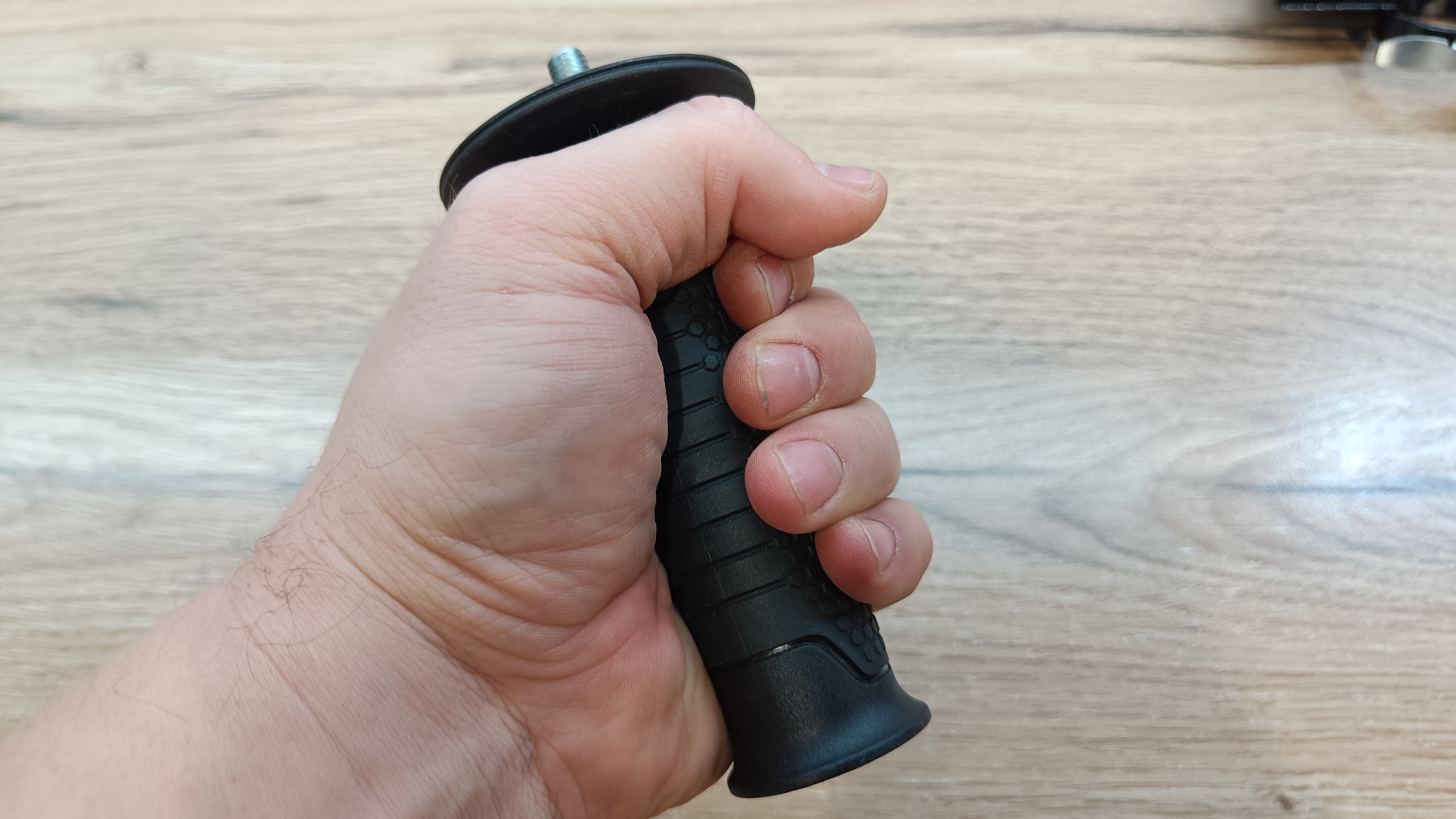 Боковая рукоятка из пластика с винтовым соединением на корпус болгарки. Есть необходимые вставки из резины, что позволяет надежно удерживать инструмент и немного снижать вибрацию. На рукоятке большой ограничитель. Ручка устанавливается на 2 стороны инструмента.