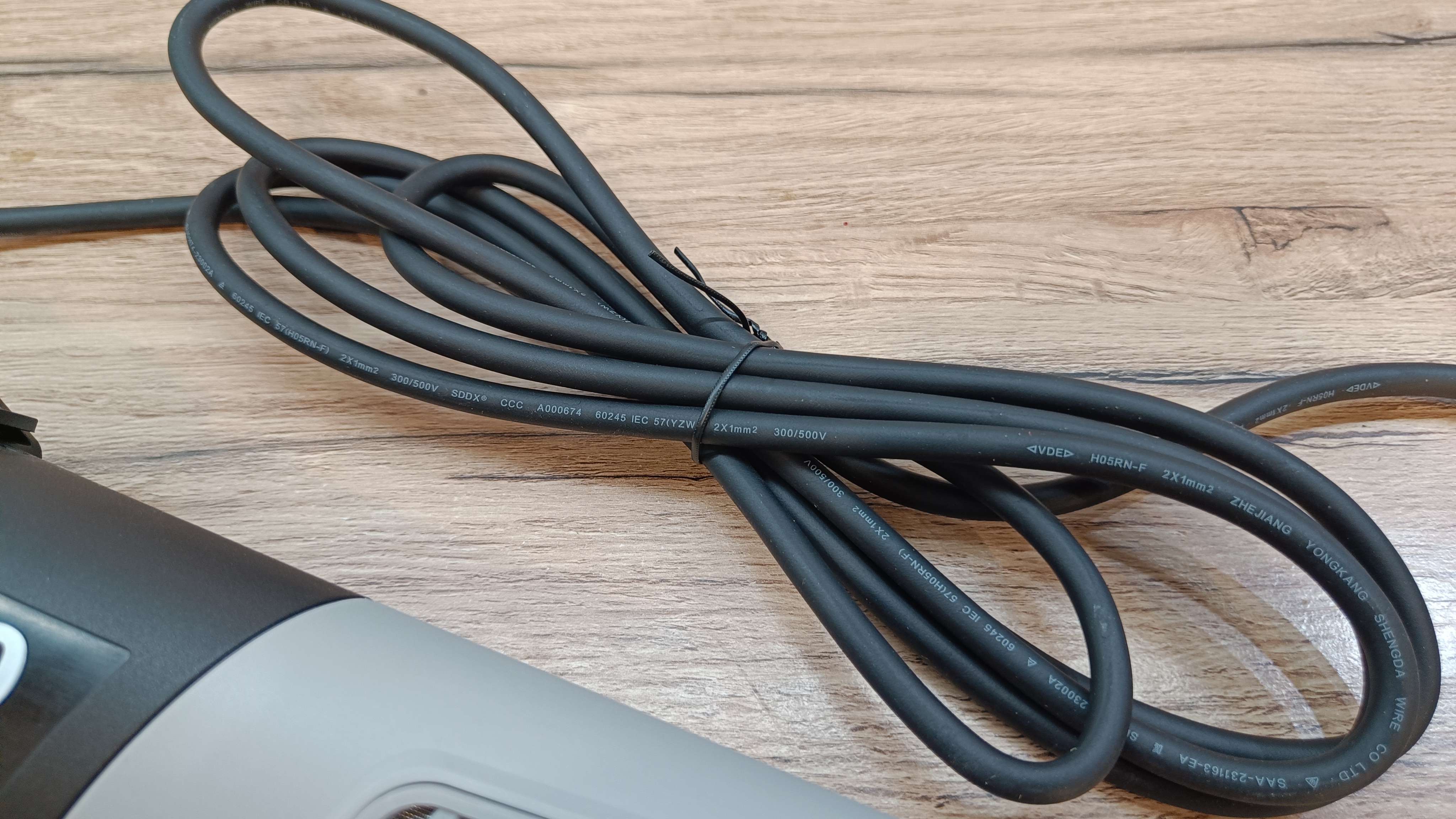 Регулятор оборотов вращения разместился с торца инструмента, рядом с питающим кабелем. Кстати, кабель в резиновой оболочке, что позволяет использовать УШМ даже при отрицательных температурах. Он остается полностью подвижным и не дубеет на морозе. Длина провода почти 3 метра, а используемое сечение 2*1мм2, что даже с запасом при заявленной мощности.