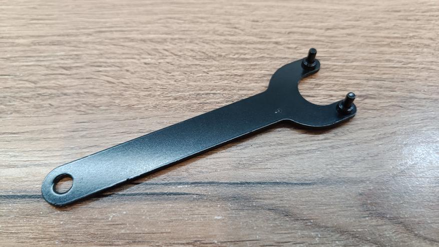 Ключ для установки отрезных дисков. Из металла толщиной около 4 мм. Запросто откручивает фиксирующую гайку диска. На конце небольшое отверстие для удобного хранения в месте работы.