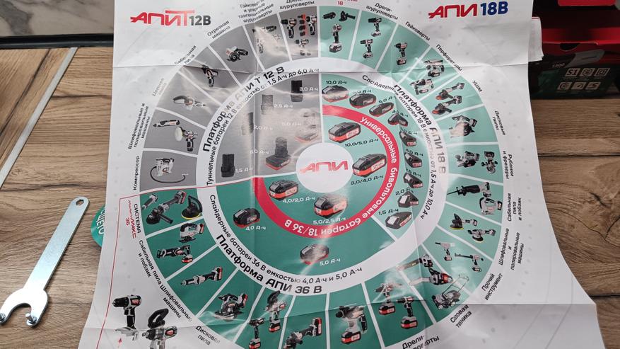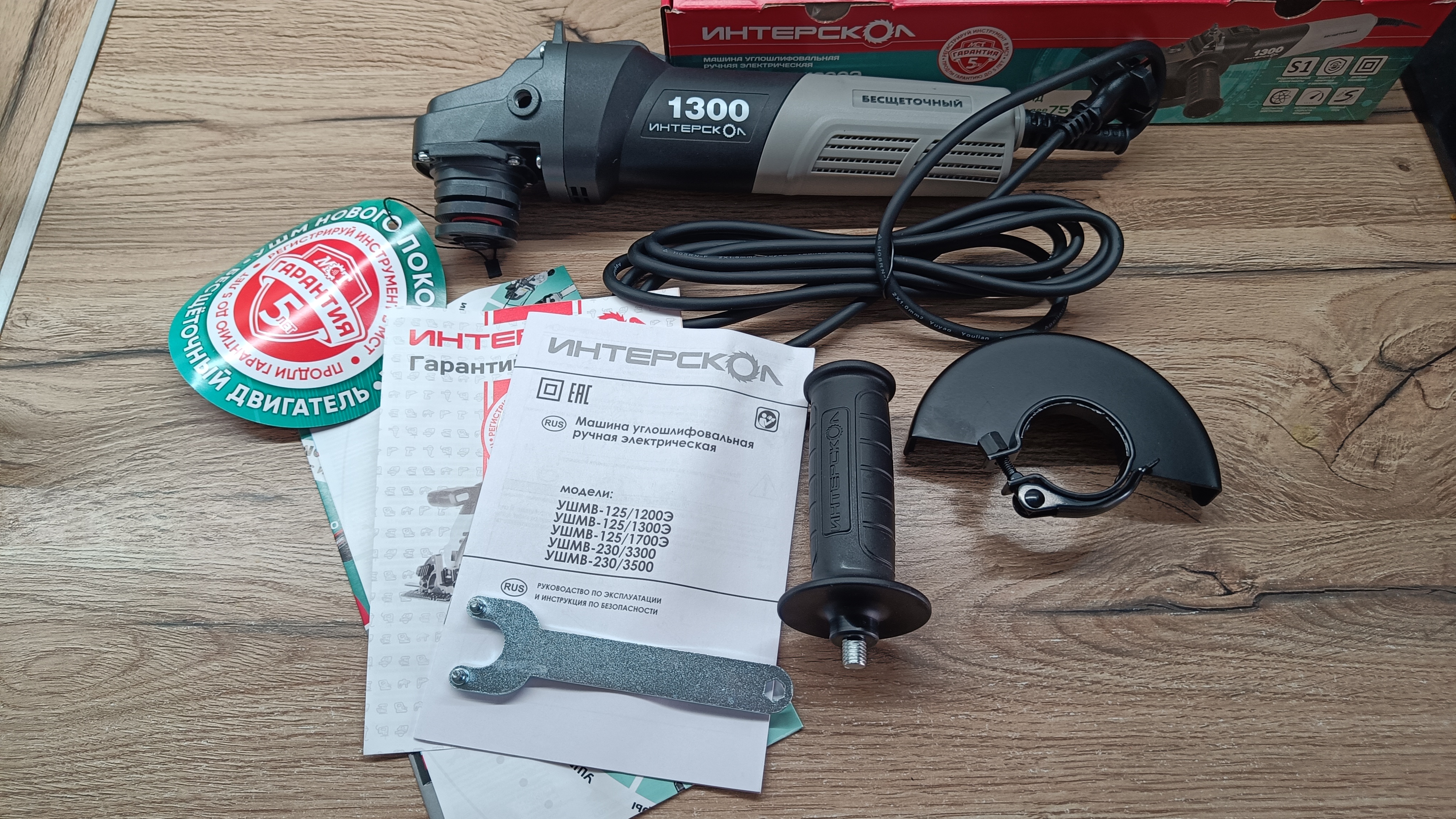 Ничего лишнего, защитный экран, ключ для установки дисков и бумажная документация. Данная УШМ не распространяется с пластиковым боксом, обычная картонная коробка с информацией о товаре и производителе. Внутри достаточно большое количество документации, в том числе по электрическому инструменту Интерскол с выделением по вольтажу и мощности. Руководство пользователя под несколько моделей УШМ.