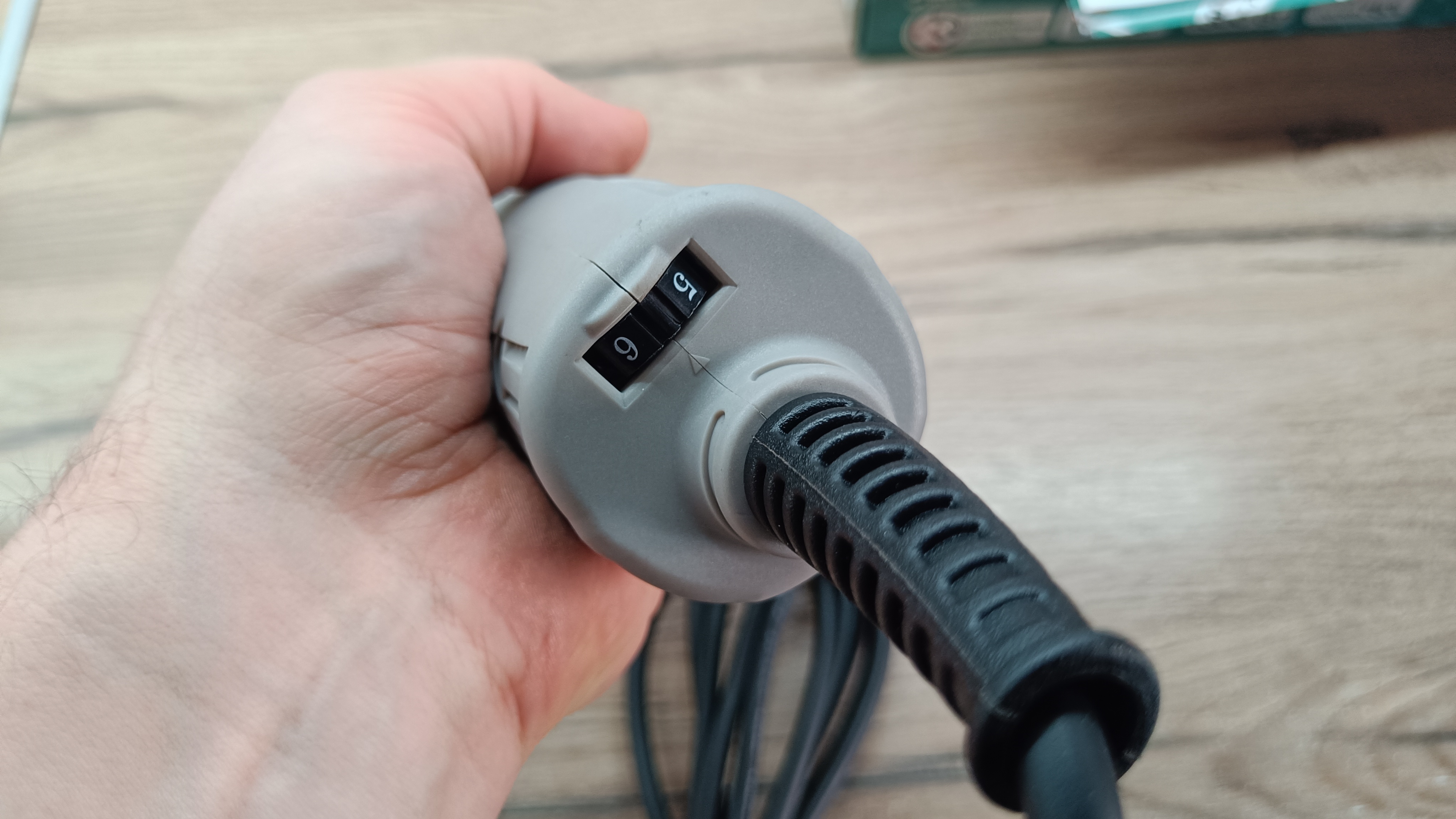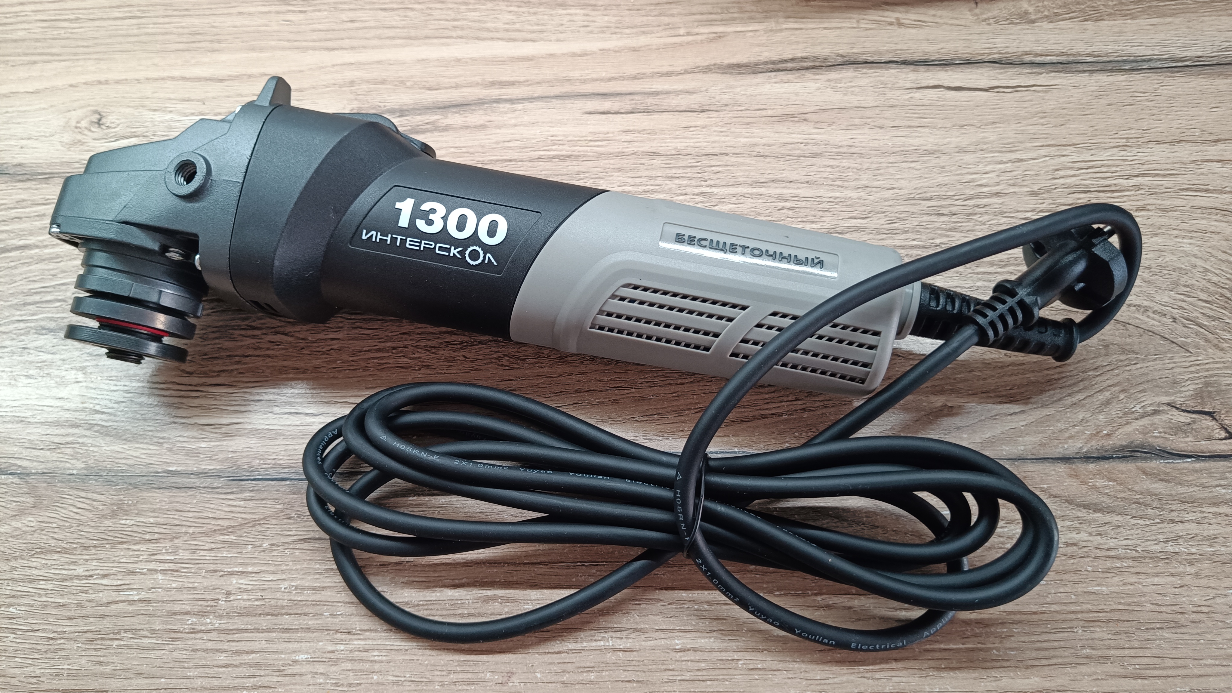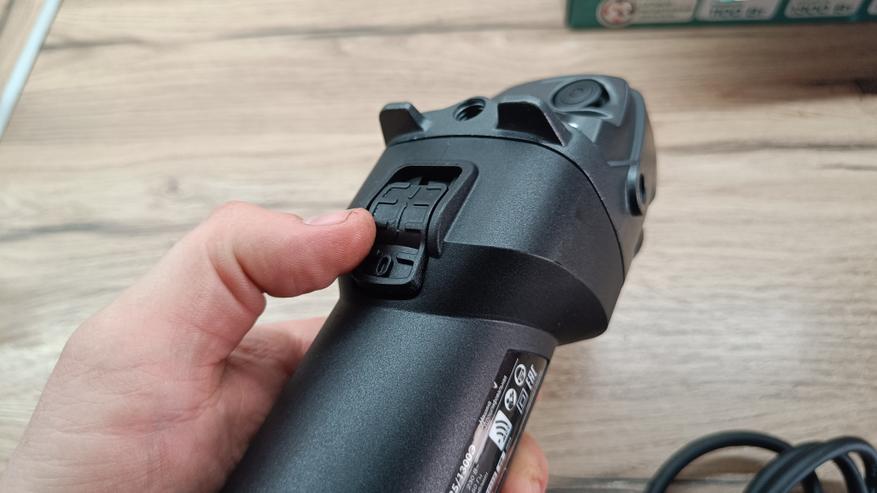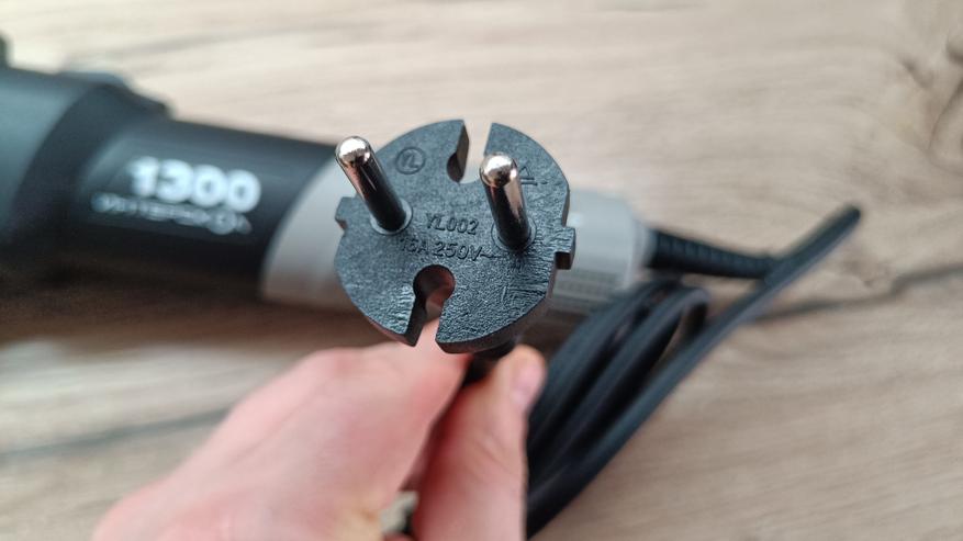 Питание инструмента за счет длинного провода в резиновой изоляции. Провод почти три метра, а указанное сечение 2*1 мм2, что для мощности 1,3 кВт более чем достаточно. На конце евровилка без заземления на 16А. Немного видоизмененный защитный кембрик. Он более резиновый и с ребристой структурой. С торца есть регулятор скорости вращения с максимальным значением в 6 положениях.
