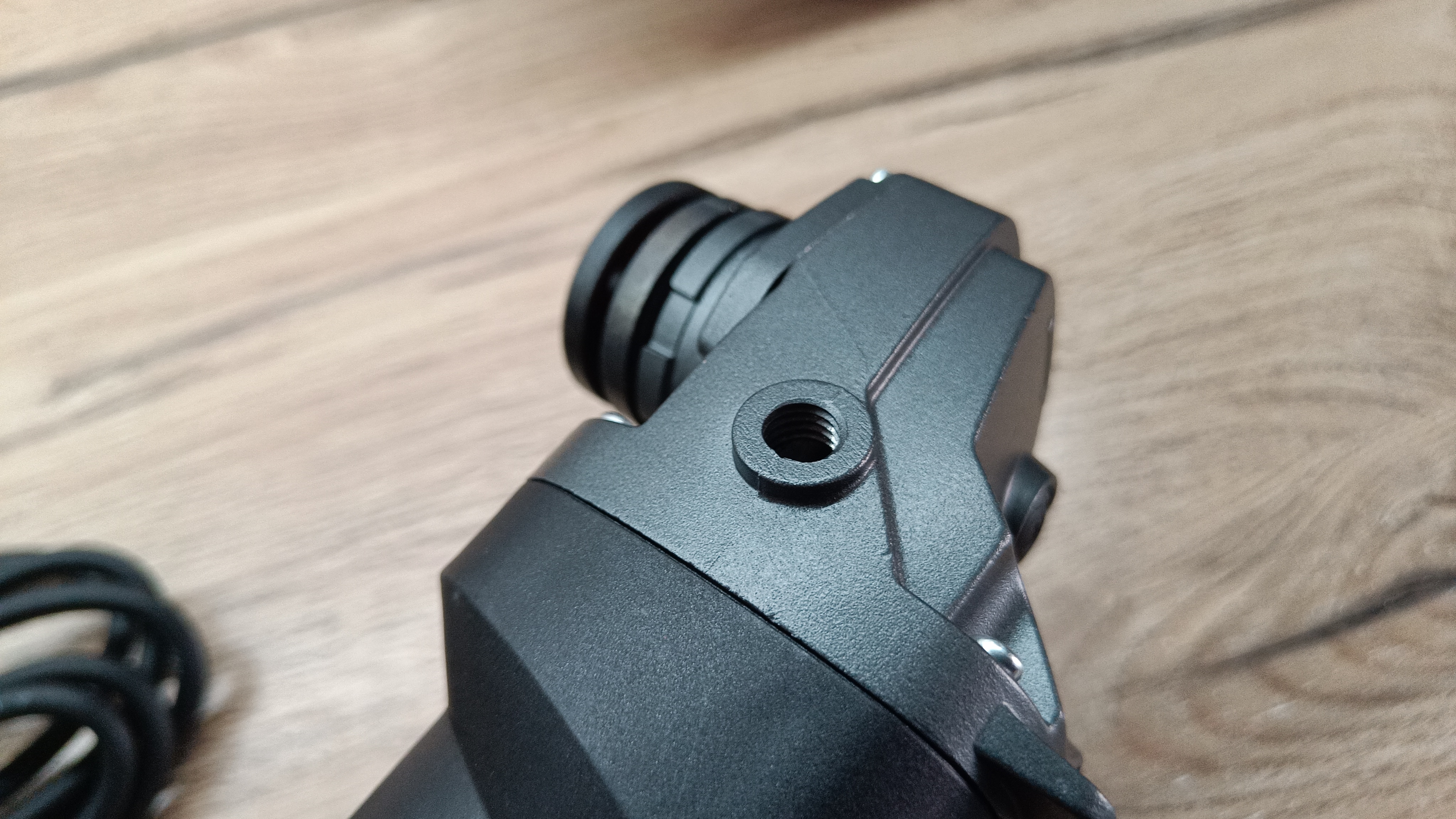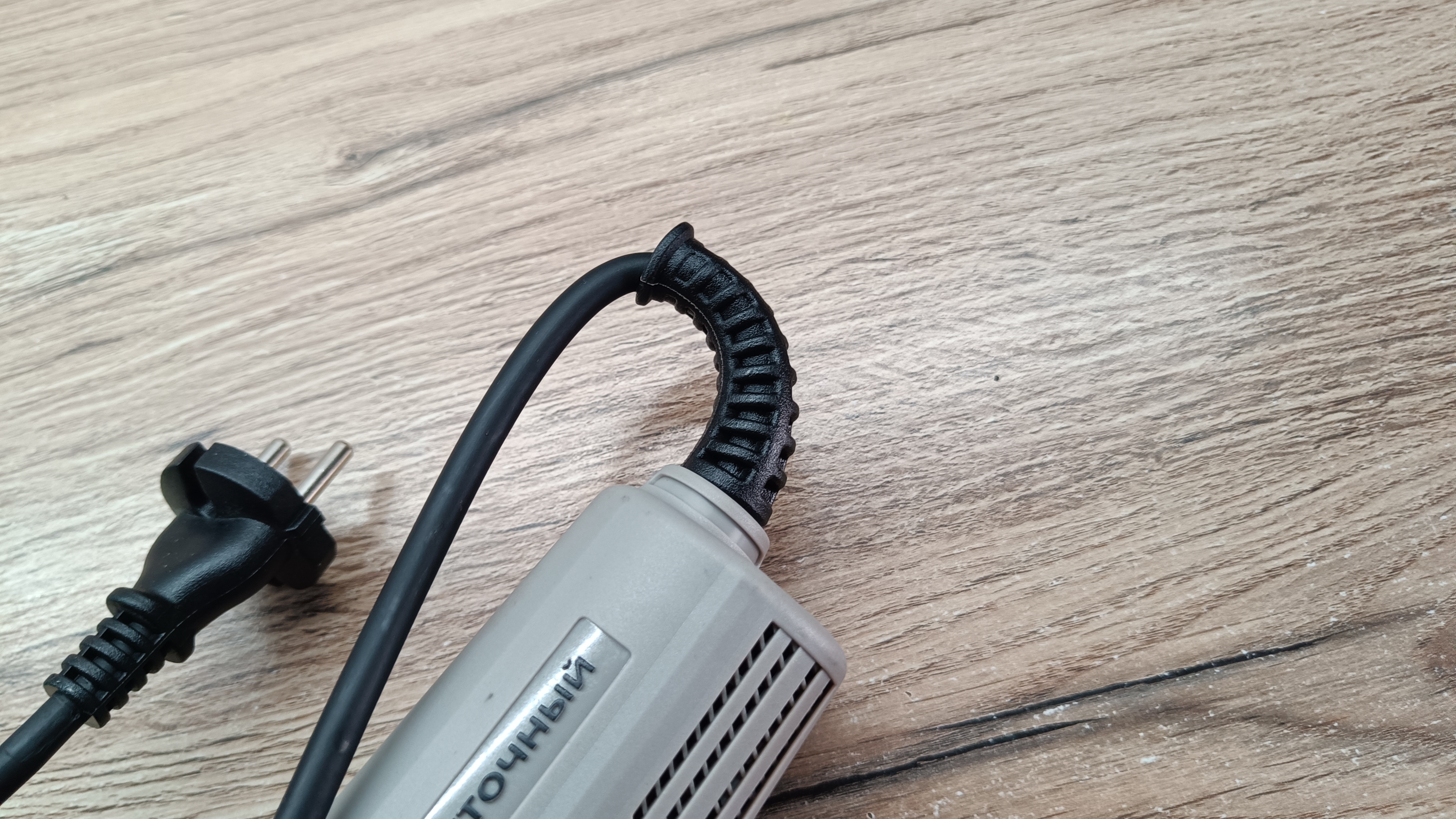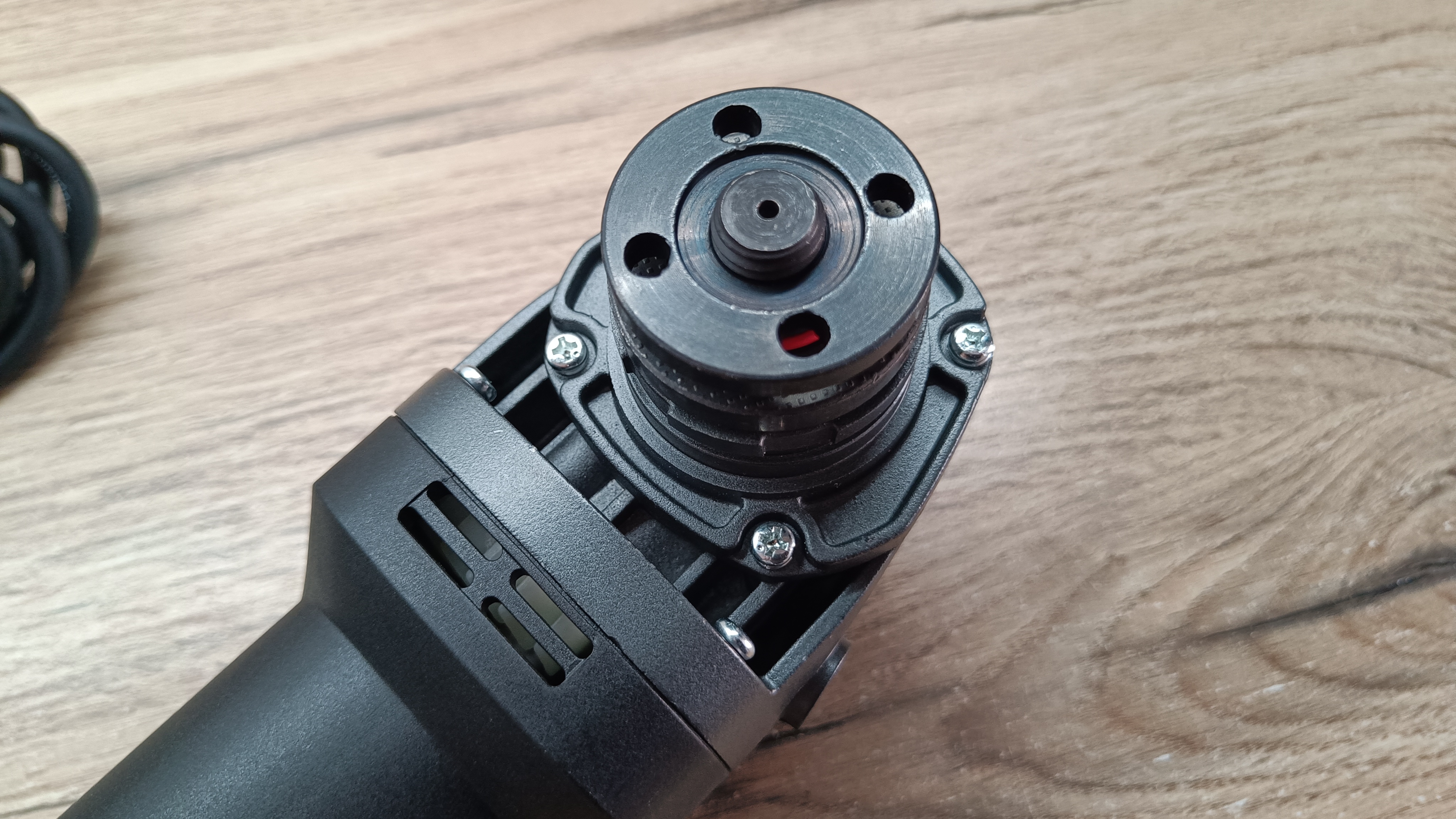 Питание инструмента за счет длинного провода в резиновой изоляции. Провод почти три метра, а указанное сечение 2*1 мм2, что для мощности 1,3 кВт более чем достаточно. На конце евровилка без заземления на 16А. Немного видоизмененный защитный кембрик. Он более резиновый и с ребристой структурой. С торца есть регулятор скорости вращения с максимальным значением в 6 положениях.