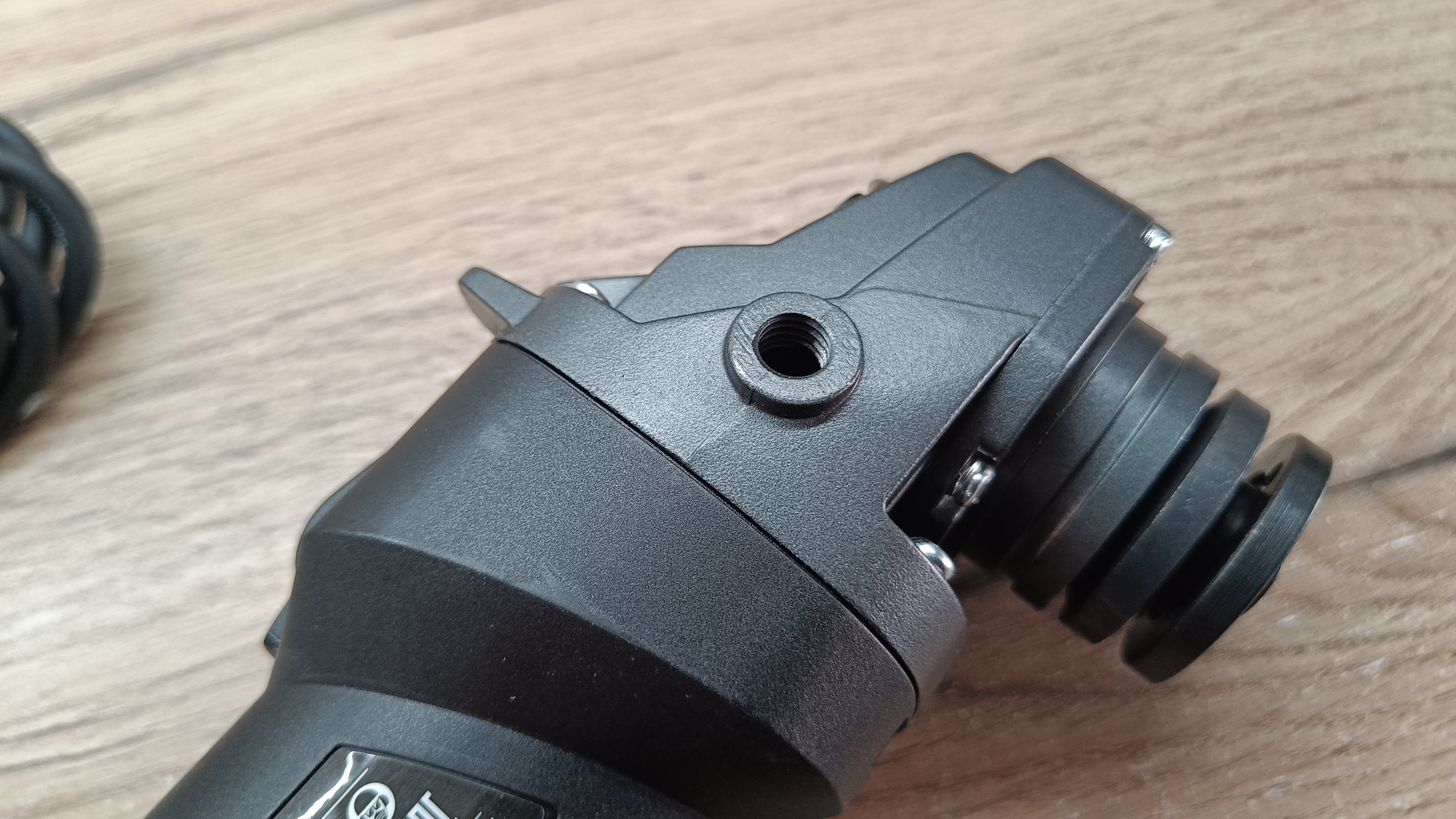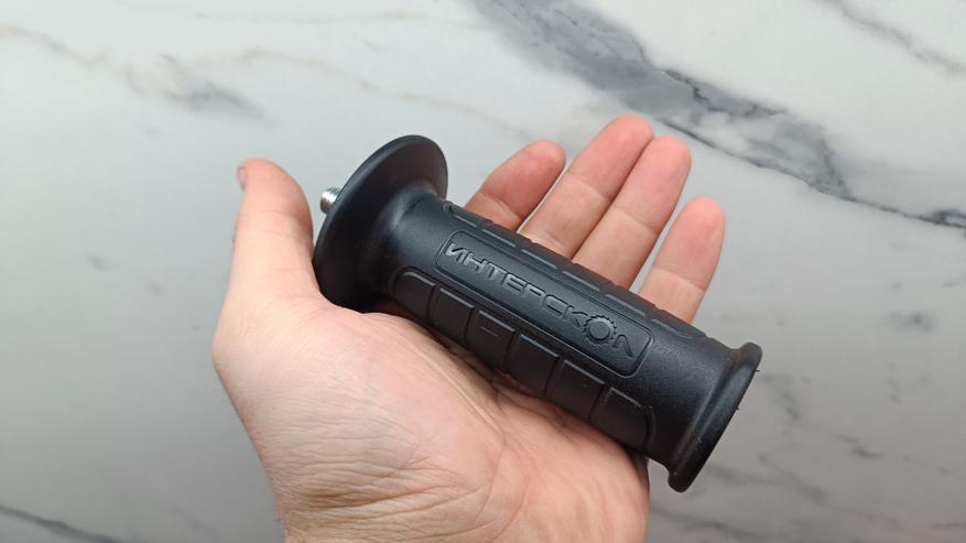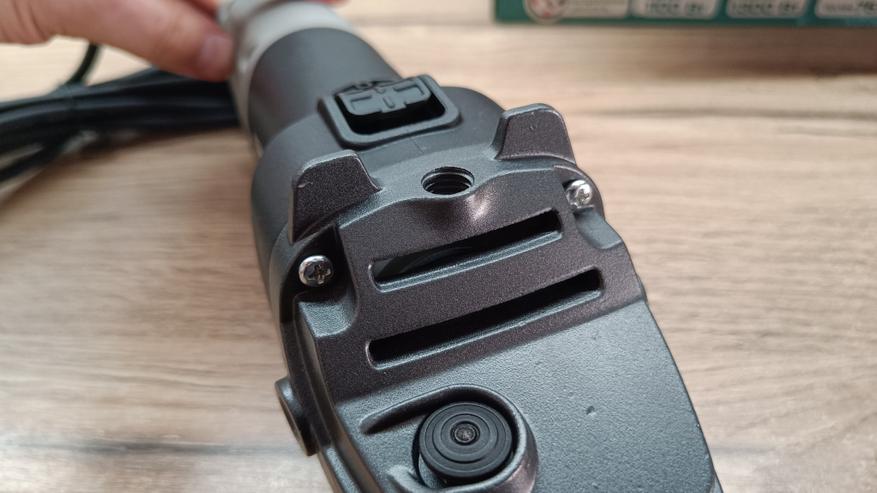 Рукоятка из пластика с большим количеством рифленой поверхности. Большой отбойник для защиты руки. Крепление за счет винтового соединения. Кстати, крепление на корпусе в 3 местах, на версии 1,2 кВт, всего в двух положениях.
