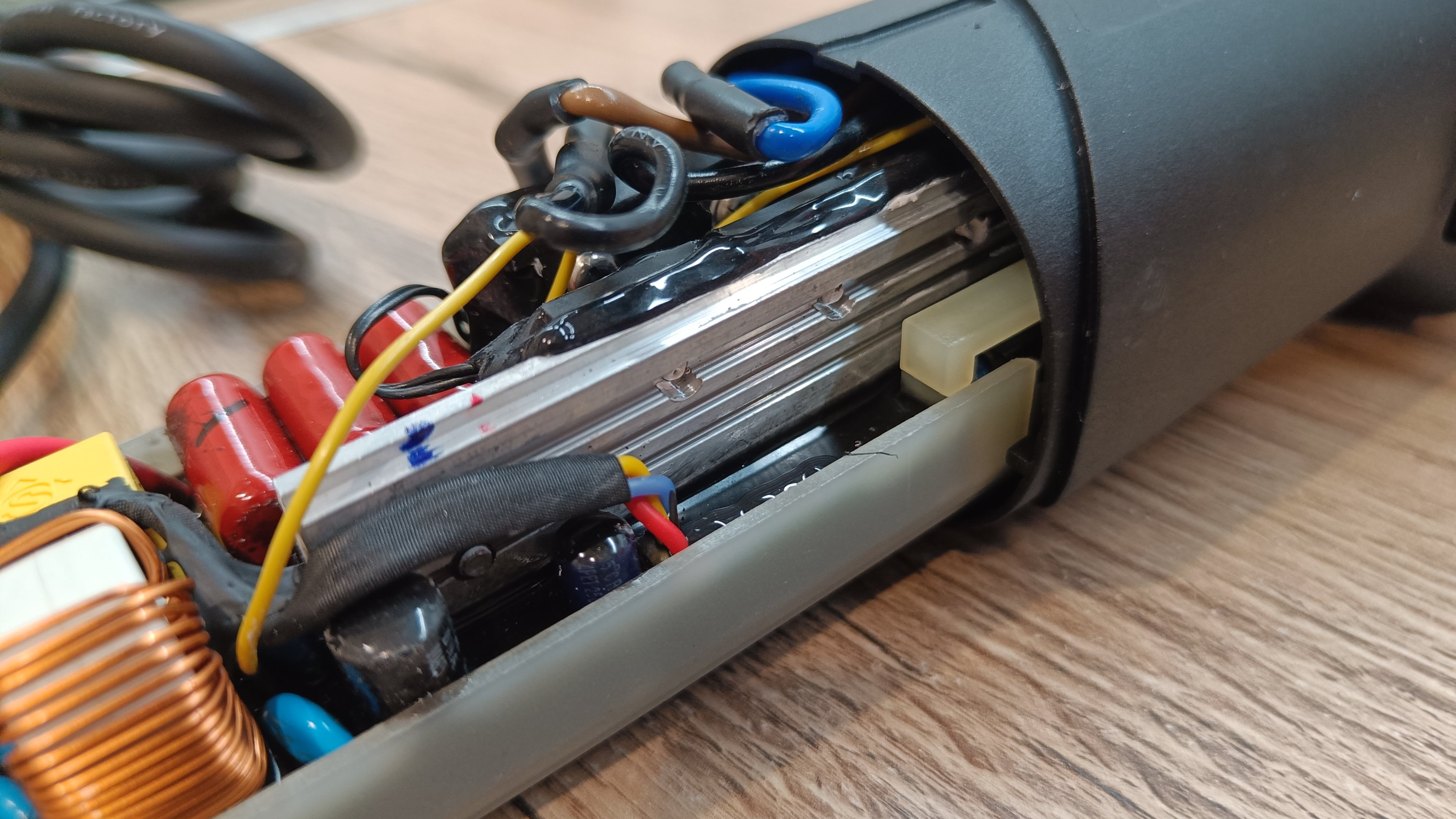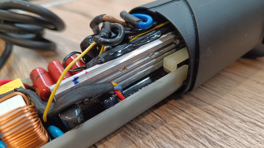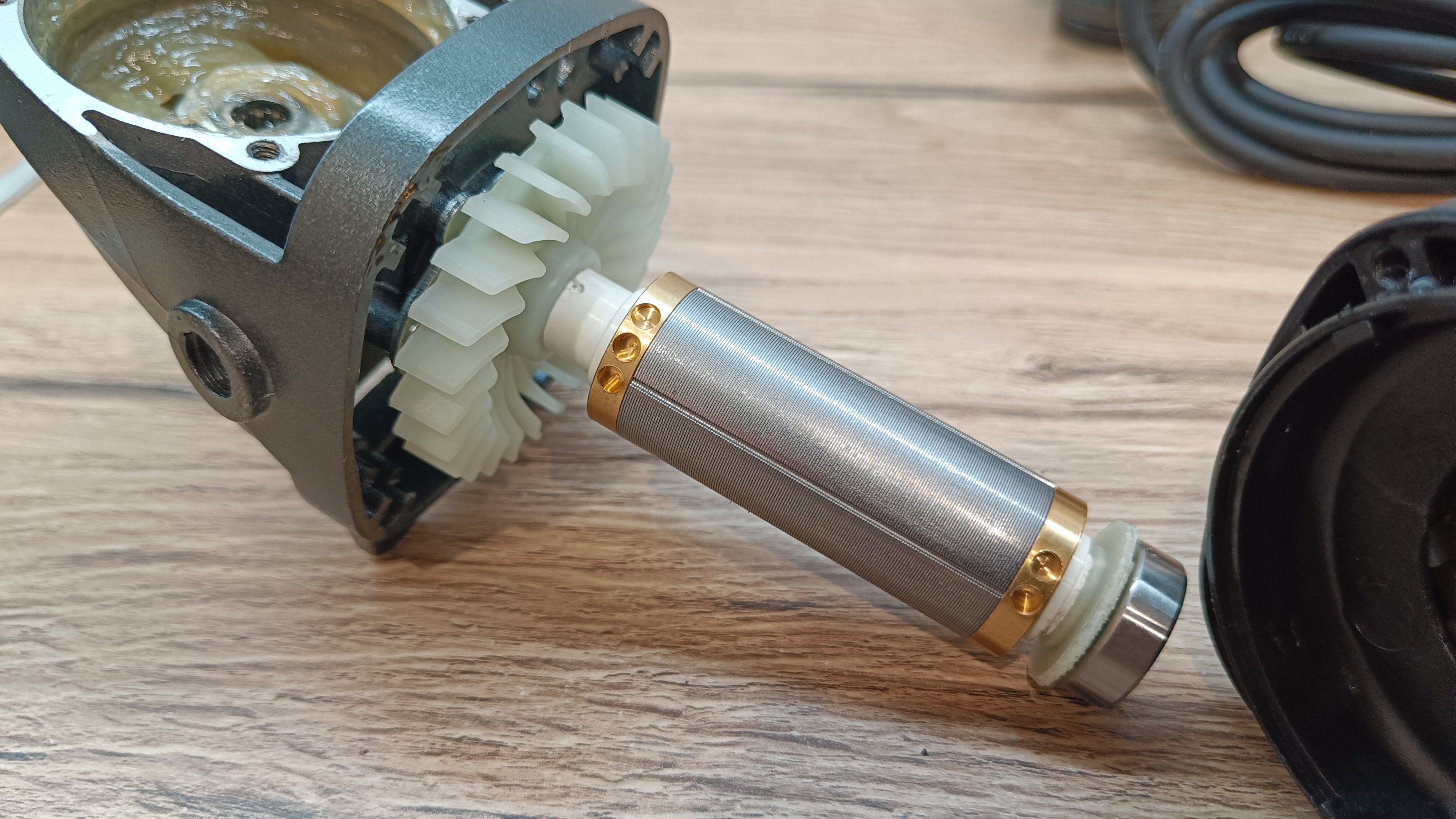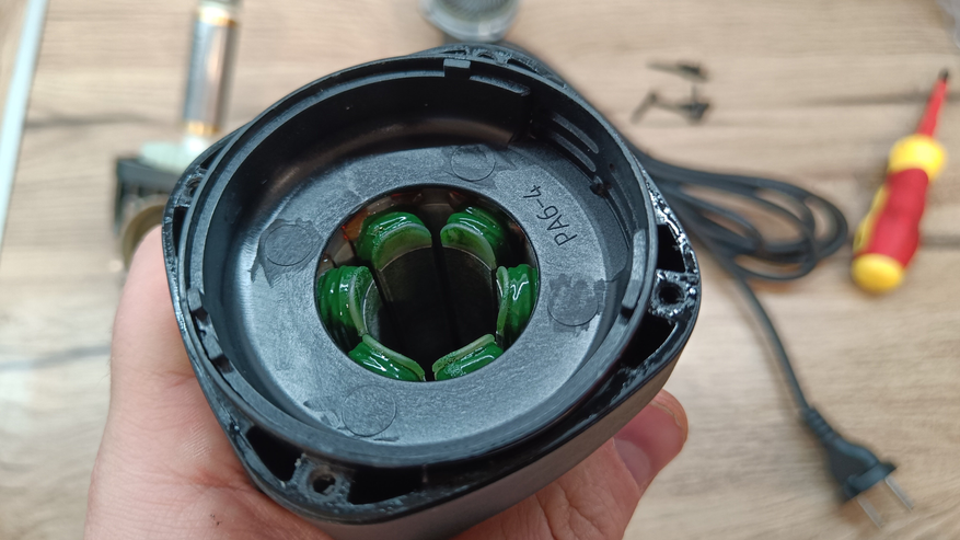 Ну и заглянул внутрь корпуса. Схемотехника осталась на прежнем уровне и почти идентична. Большая плата управления и алюминиевым радиатором охлаждения элементов. Схема собрана с использованием проводов в силиконовой изоляции, они менее подвержены высоким температурам и трению. На якоре видны следы центровки. Подшипники закрытые металлическими накладками. Обмотка с защитным лаком.