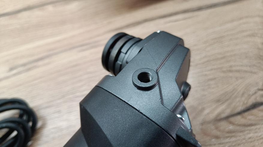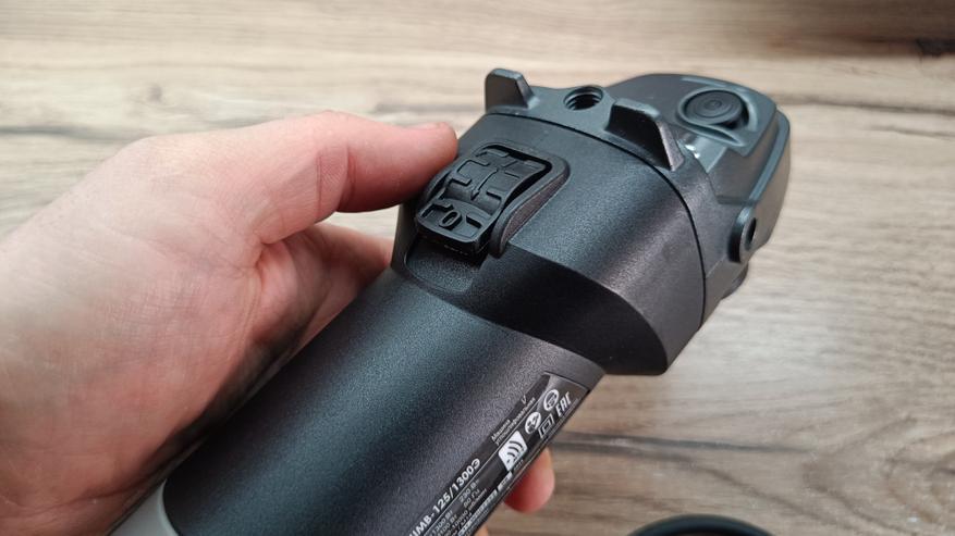 Дополнительная ручка устанавливается в трех положениях, что не свойственно инструменту из данного ценового диапазона. С тыльной стороны есть кнопка фиксации шпинделя для замены диска и индикация стороны вращения диска.