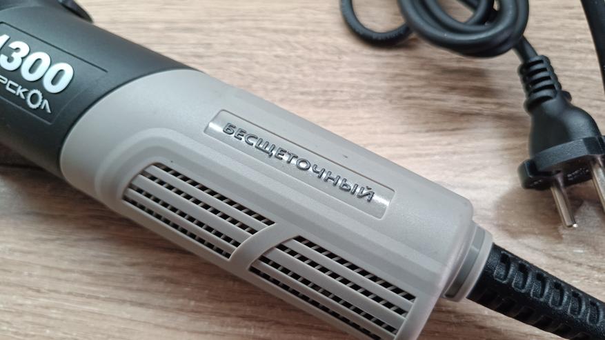 Корпус изготовлен из пластика черного и серого цвета. Крупными цифрами выделена версия инструмента. В данном случае 1300, что указывает на потребляемую мощность устройства. Также производитель выделил отдельным текстом упоминание об использовании бесщеточного двигателя для вращения шпинделя. В нижней части большое количество вентиляционных отверстий, за которыми размещается мелкая металлическая сетка.