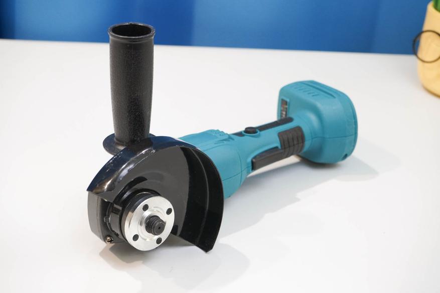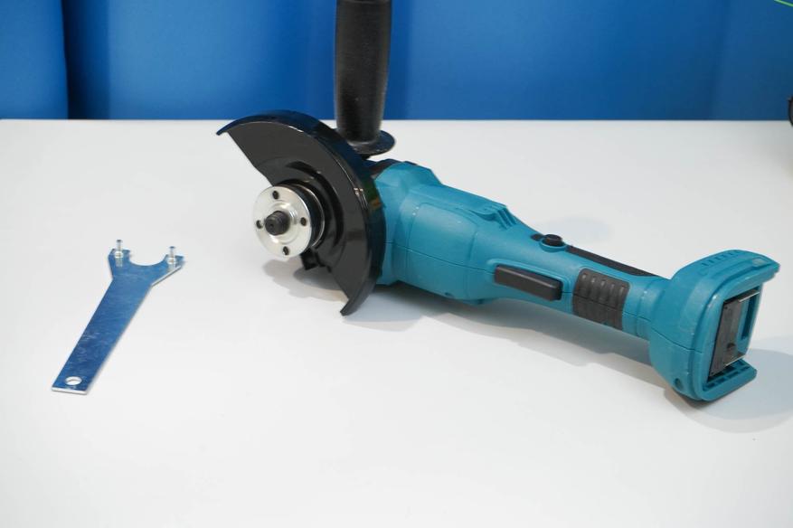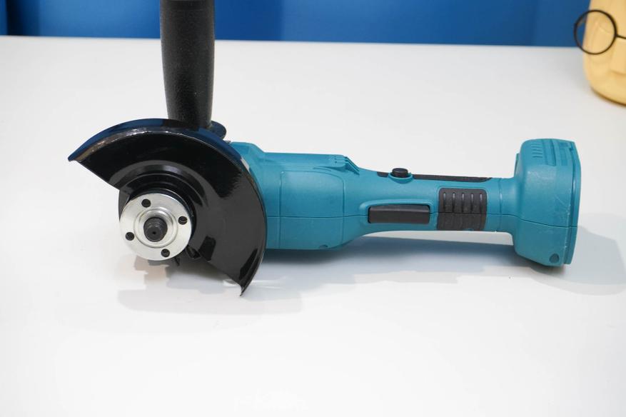 Нашел «болгарку», которая отличается кнопкой включения — установлена кнопка куркового (клавишного/педального) типа. Такой вариант может оказаться удобнее в работе, чем привычные кнопки типа «ползунок». УШМ бюджетная, стоит совсем недорого, её не накладно взять себе в гараж или в мастерскую, использовать для ремонта дома или на объекте. Работает такая «болгарка» от аккумуляторных батарей типоразмера Макита LXT 18V или совместимых.