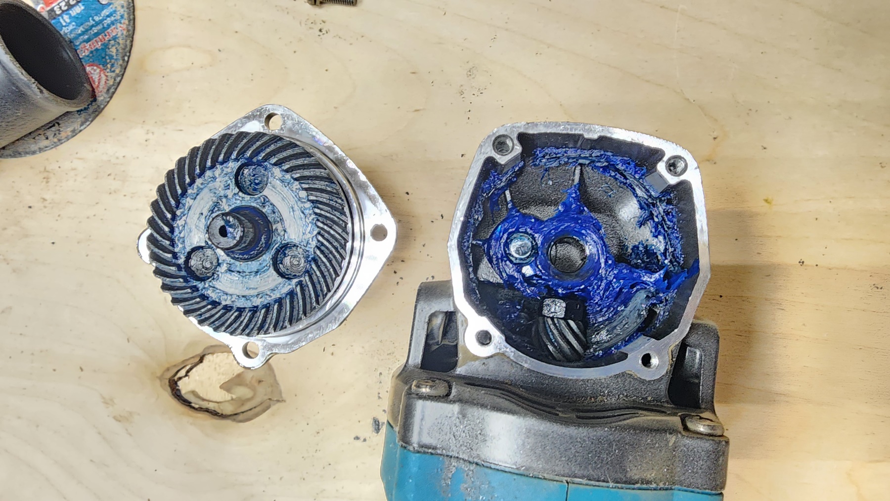 Разобрал редуктор после 40 часов работы. Смазка есть, но её раскидало по периферии корпуса. Хорошо, что не сухие шестерни. Добавил своей смазки и закрыл редуктор.