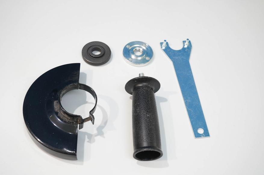 Вот так выглядит УШМ в сборе с защитным кожухом, с установленной упорной ручкой. Ручку, к слову, можно переставить на одну из двух сторон корпуса. Рукоятка имеет частичное покрытие резиноподобным материалом, чтобы не скользило при работе, например, в защитных перчатках.