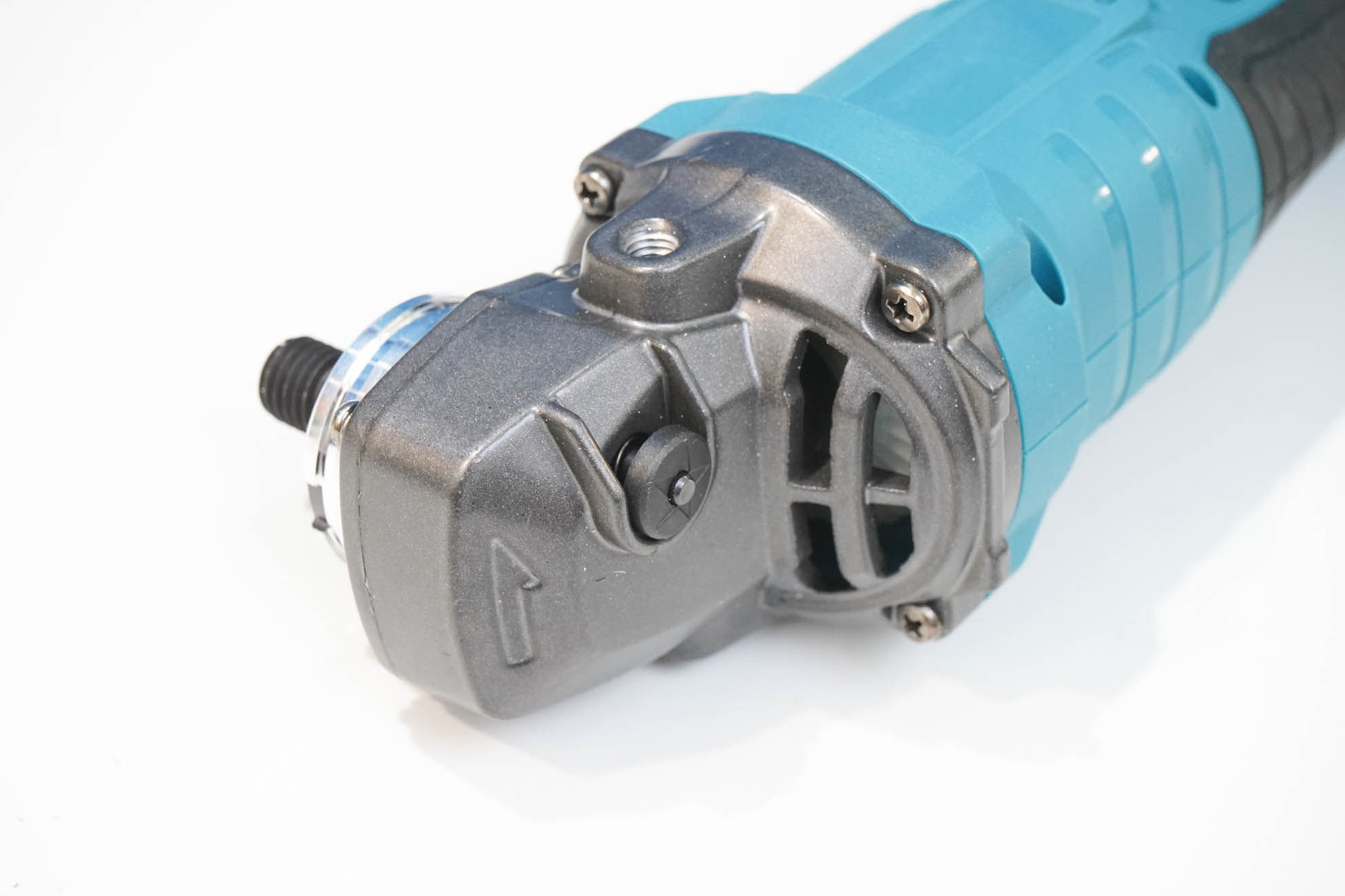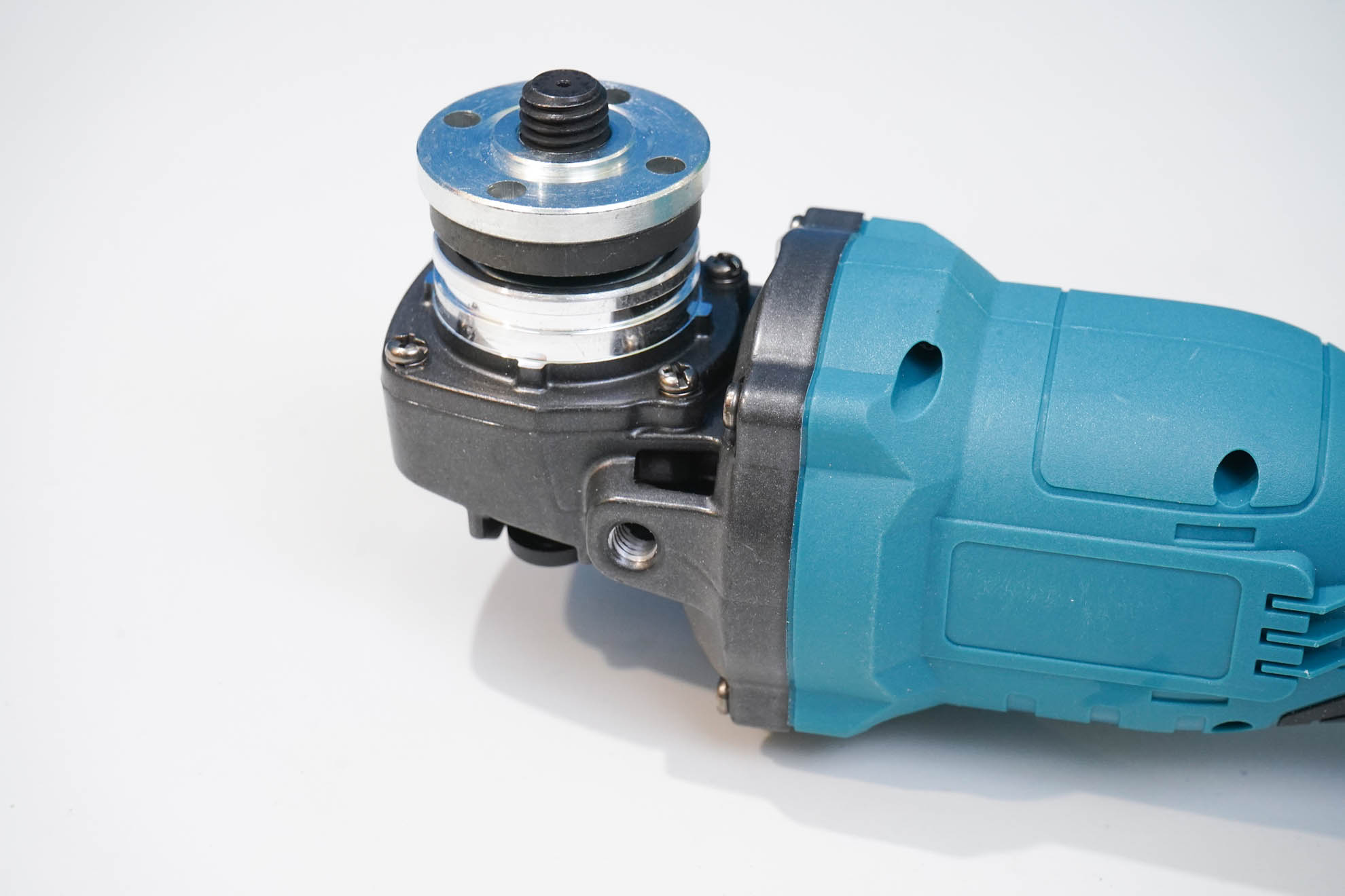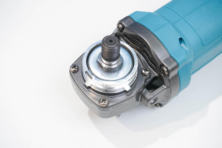 Отмечу тонкий профиль корпуса — внутри скрывается бесщеточный двигатель, система управления с регулировкой и поддержанием оборотов. Редуктор у этой модели отличается по цвету — затемненный алюминиевый корпус редуктора. В остальном же это привычный шпиндель М14, подходят стандартные насадки для УШМ, установлены обычны гайка-шайба. Можно заменить на быстрозажимную гайку, но её потребуется приобретать отдельно.