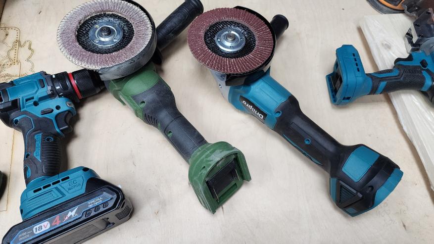 Аккумуляторные батареи подходят для всего моего «зоопарка» инструментов. Это определенный плюс, так как не требуется бегать и искать оригинальную зарядку, ждать заряда одной батареи из комплекта. На фото УШМ из предыдущего обзора, а также дрель и беспроводные ножницы по металлу — все с одной системой питания.