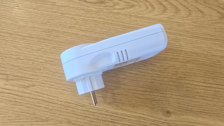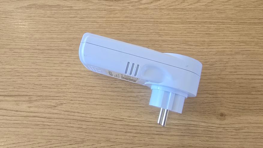 Задняя часть корпуса выполнена из того же белого пластика. Здесь нанесена информационная наклейка с названием производителя, моделью, техническими параметрами и маркировками соответствия. Ниже расположен встроенный сетевой разъем с двумя штырями стандарта Europlug и контактами заземления. В верхней части находится крышка скрывающая доступ к трем батарейкам, благодаря которым устройство хранит в памяти информацию о последних измерениях.
