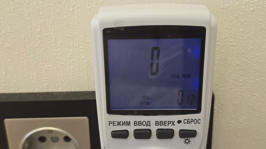 Еще один режим показывает суммарное время работы и стоимость потребленной электроэнергии. Так как я заранее установил цену за кВтч, прибор начал считать и денежный эквивалент, хотя при нагрузке в 100 Вт цифры набегают очень медленно.