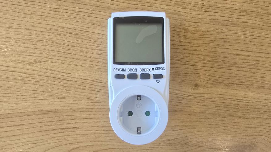 Организация отображения информации построена на цикличном переключении экранов. Кнопкой можно поочередно просматривать напряжение и частоту, коэффициент мощности вместе с током или мощностью, суммарное энергопотребление, общее время работы и стоимость, а также результаты по тарифным режимам. Предусмотрена функция сброса накопленных данных.