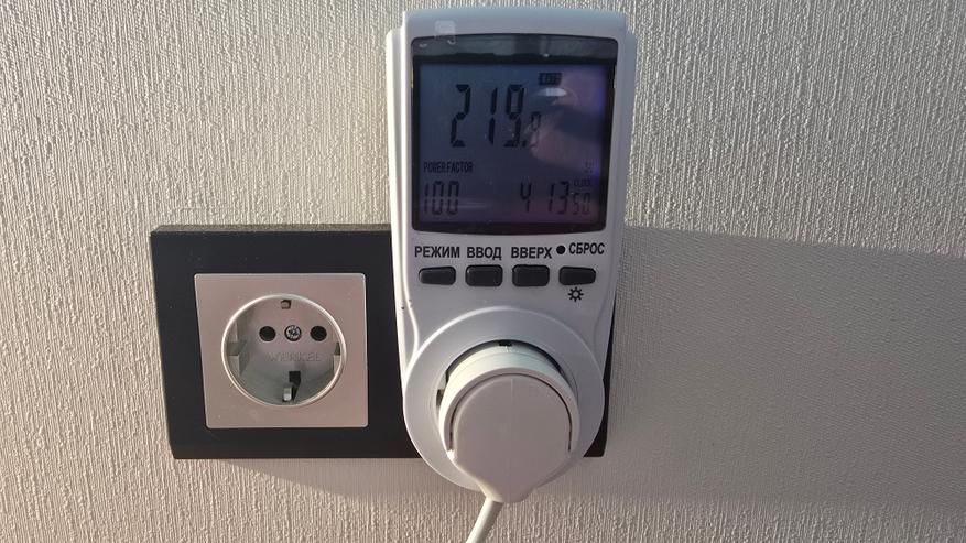 На первом экране ваттметр показал напряжение в сети и частоту. У меня прибор стабильно держал около 229-231 В и 50 Гц. Это как раз то, чего я и ожидал увидеть.