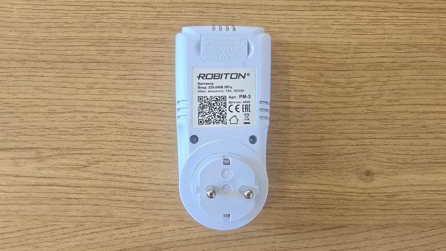 Ваттметр Robiton PM-3 выполнен в формате розеточного адаптера. Спереди располагается крупный прямоугольный дисплей, который занимает верхнюю часть корпуса. Под экраном находится ряд из четырех кнопок, подписанных как «Режим», «Ввод», «Вверх» и «Подсветка». Рядом с ними, чуть выше, правее подсветки вынесена отдельная кнопка «Сброс». В нижней части корпуса предусмотрено сквозное розеточное гнездо типа Schuko с заземляющими контактами.