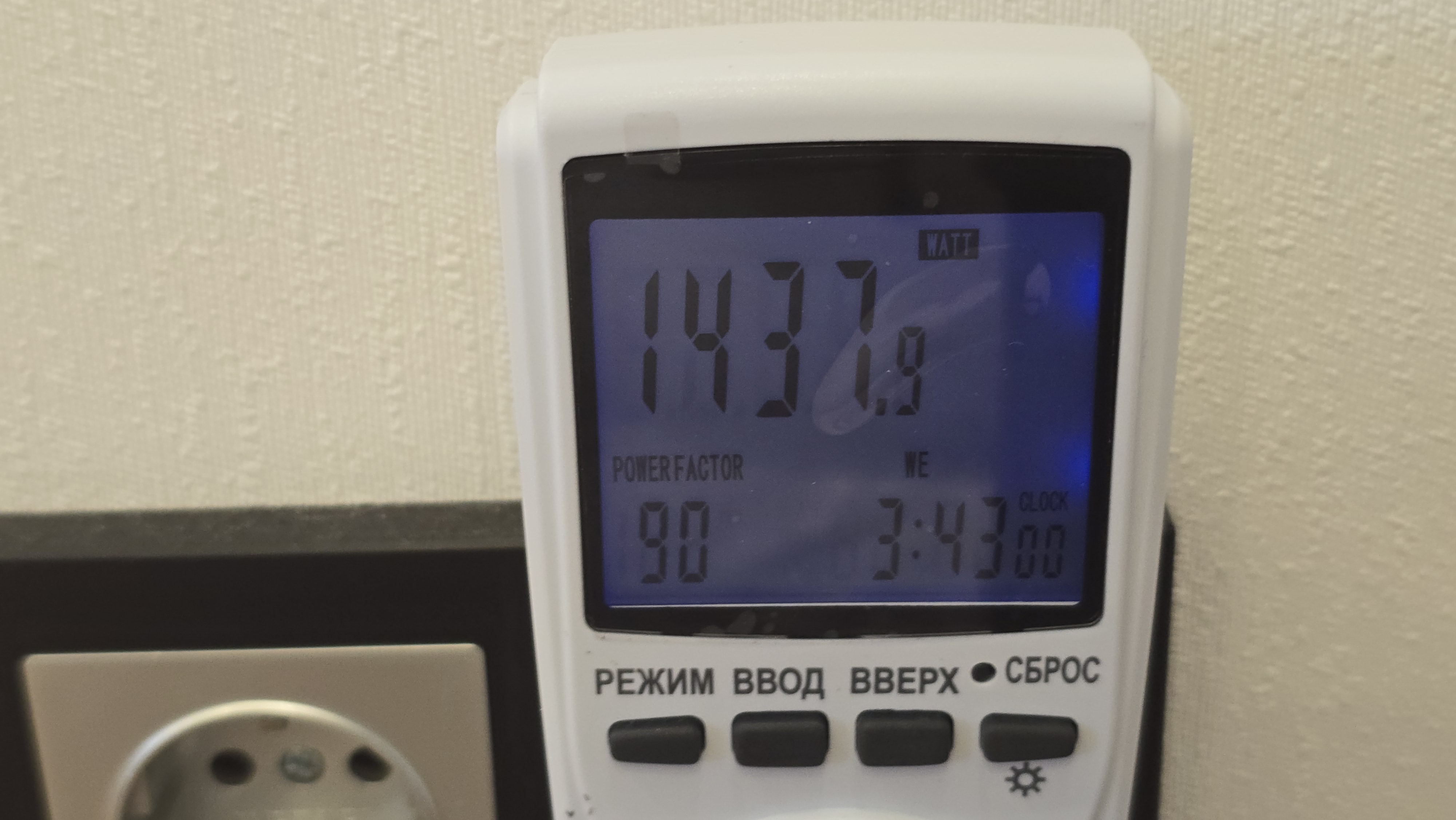 Дальше стало интереснее. В дело пошел фен, у которого режимов работы больше, чем у некоторых обогревателей. На минимальной мощности ваттметр показывал порядка 400-500 Вт, при среднем нагреве цифры прыгали уже ближе к 1000-1100 Вт, а на максимуме доходили до 1500-1600 Вт. Визуально все выглядело логично: чем сильнее фен гудит и греет, тем выше значения на экране. Я специально переключал режимы туда-сюда, чтобы понять, насколько быстро прибор реагирует, и задержек в показаниях почти не заметил.