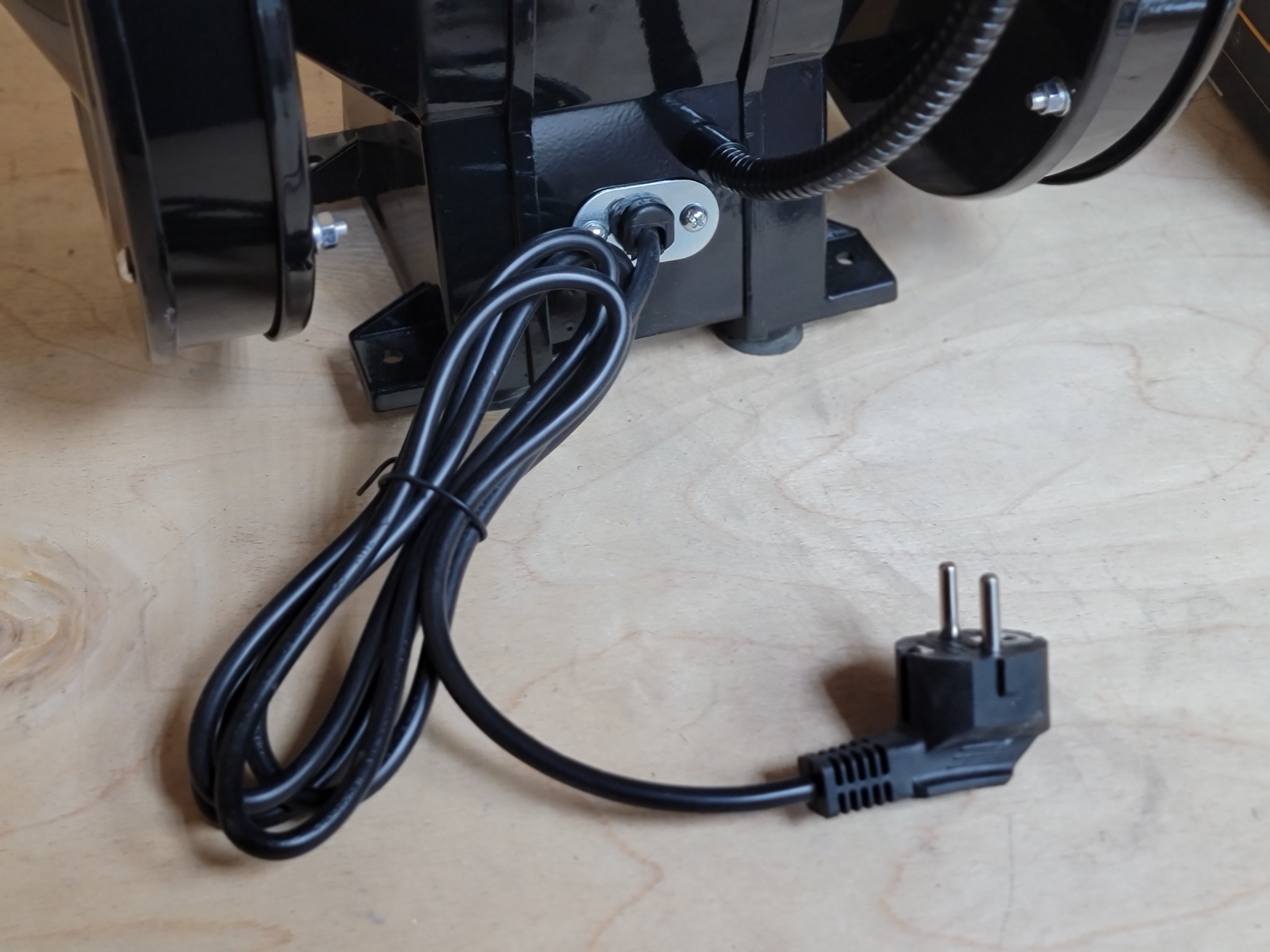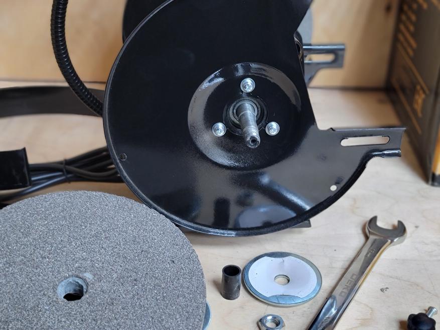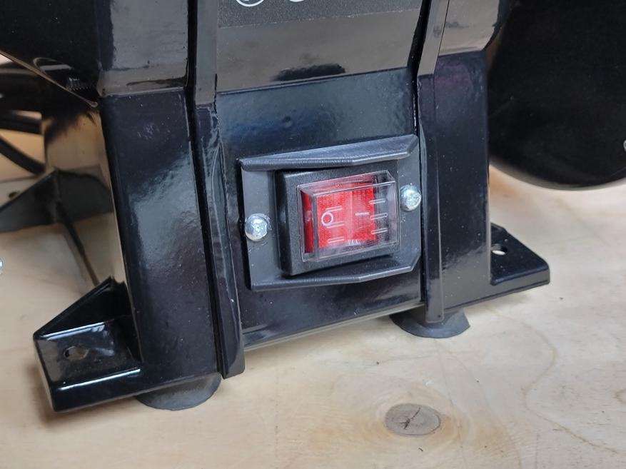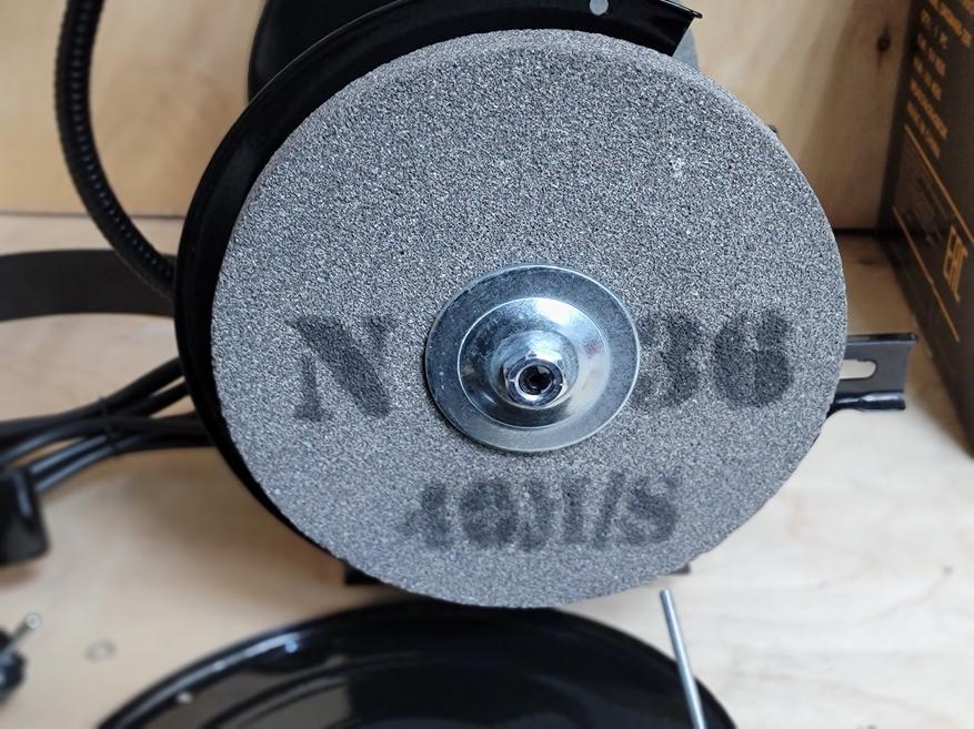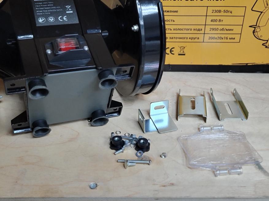 Станок приходит в сборе и готовым к работе, за исключением защитных шторок и упора. Они требуют самостоятельной установки. Процедура не сложная и занимает примерно пару минут. Заодно можно отрегулировать упор относительно поверхности круга и выставить нужный угол для заточки. Сам станок есть смысл прикрутить к столу через опоры, таким образом при стационарном использовании исключаются лишние вибрации и перемещения станка при работе.