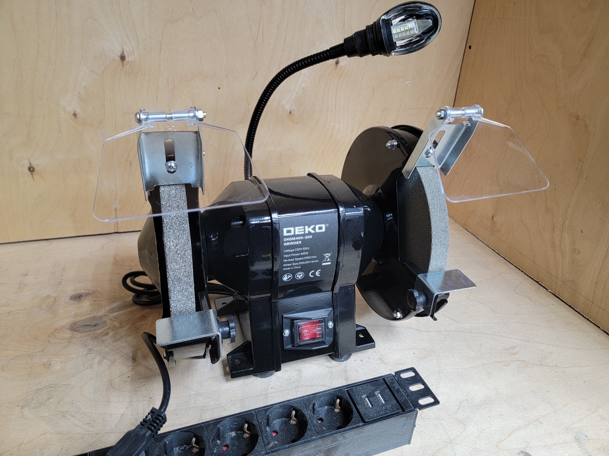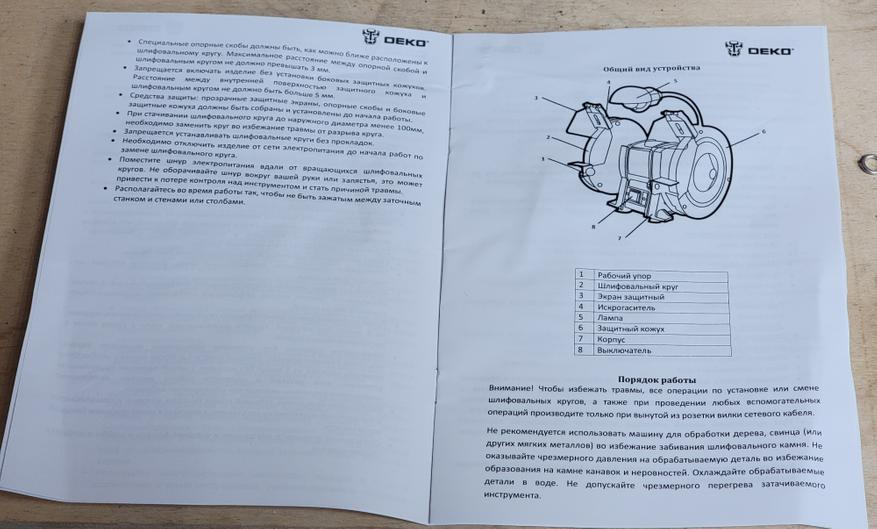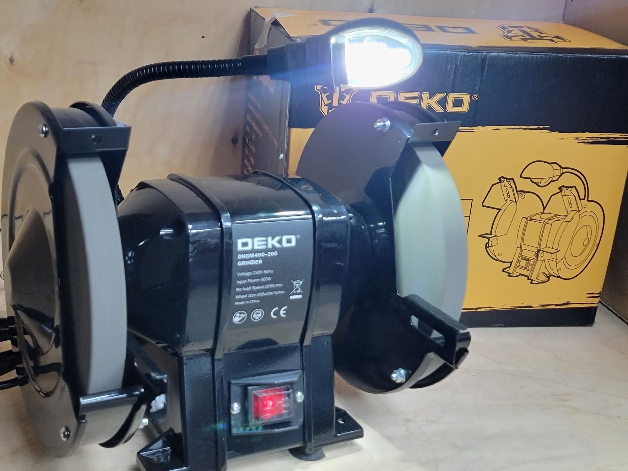 Заточной станок DEKO порадовали своей простотой и полезностью. Наверное, это один из основных инструментов в гараже. Понравилась продуманная организация защиты при работе, особенно откидные шторки, а также отмечу подсветку на гибкой ножке.