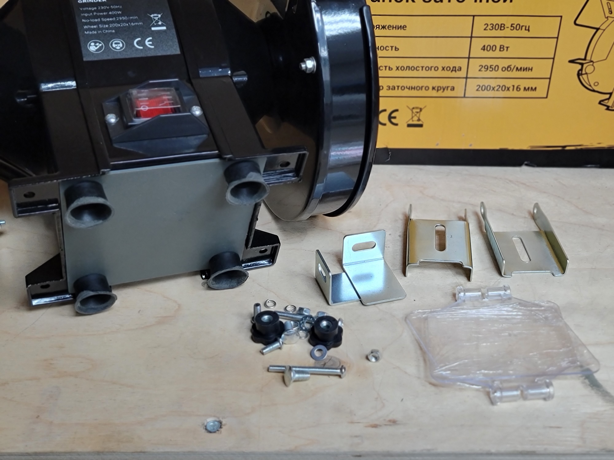 На коробке и на наклейке на корпусе самого станка присутствуют все основные характеристики: мощность, номинал питающей сети, обороты холостого хода, а также маркировка используемых заточных кругов (200 х 20 х 16 мм).