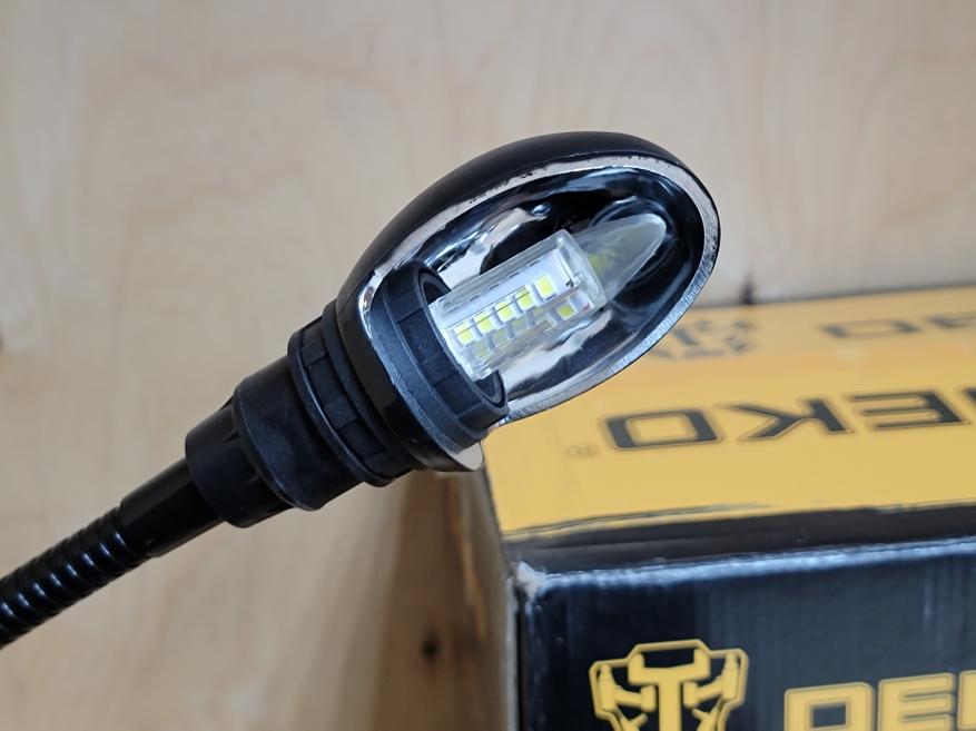 Еще один момент, который заслуживает внимания, это освещение рабочей зоны. Заточной станок оборудован светодиодной лампой на гибкой ножке. Можно развернуть лампу в удобное положение, наклонить к левому или правому диску, подобрать комфортный угол освещения.