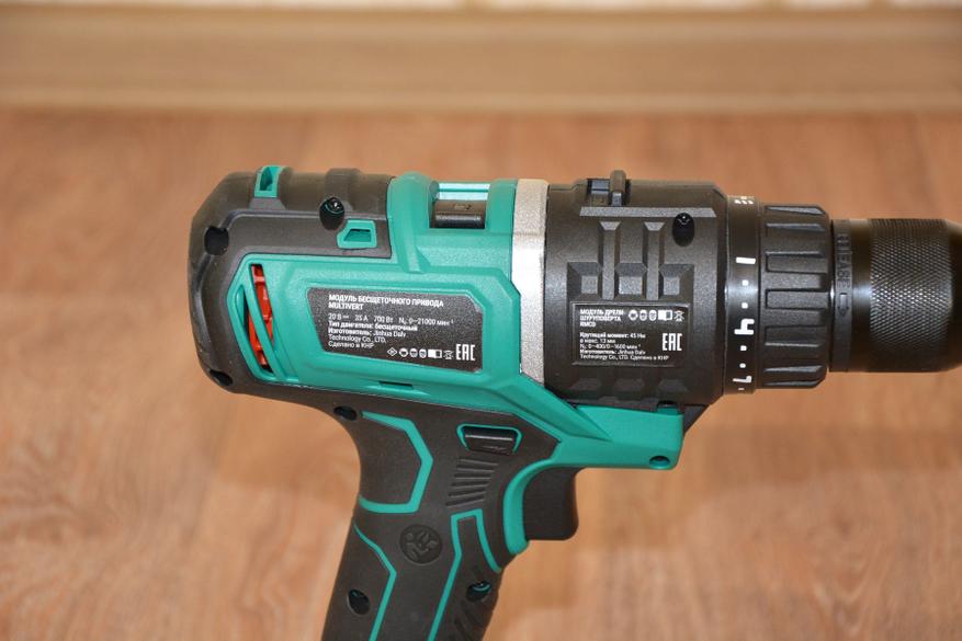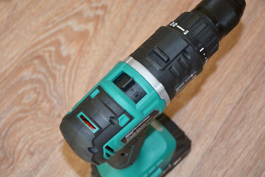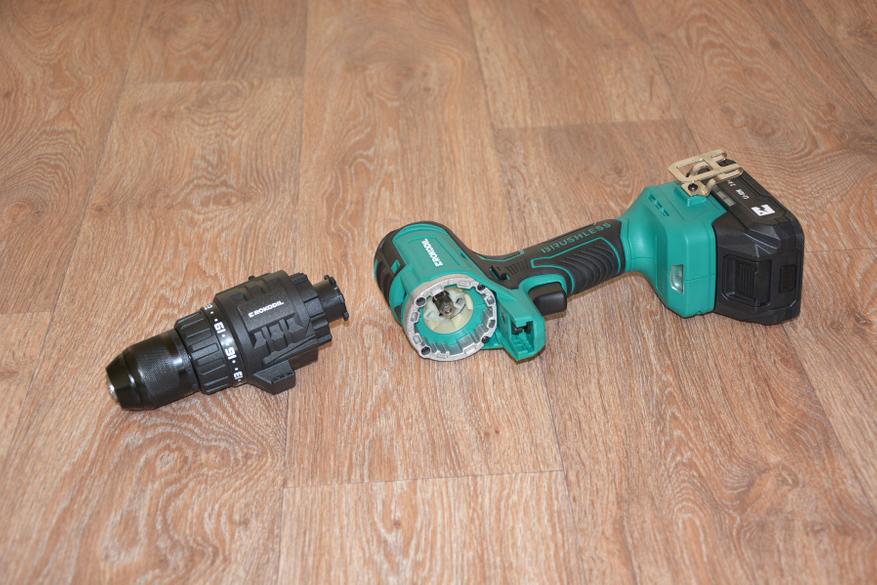 Даже муфта переключения крутящего момента с отдельной меткой режима сверления не выдает ничего необычного. Однако стоит взглянуть с другой стороны или сверху — становится заметно отличие от обычной дрели. Конструкция состоит из двух частей: модуля бесщеточного двигателя мощностью 700 Вт и модуля дрели-шуруповерта. Переключатель диапазонов скоростей с 0-400 на 0-1600 об/мин расположен ближе к муфте установки крутящего момента, а за ним фиксатор модуля. Передвинув его влево до упора и потянув модуль вперед, легко отделяем его от модуля двигателя.