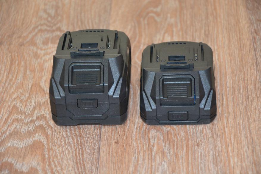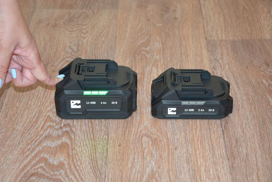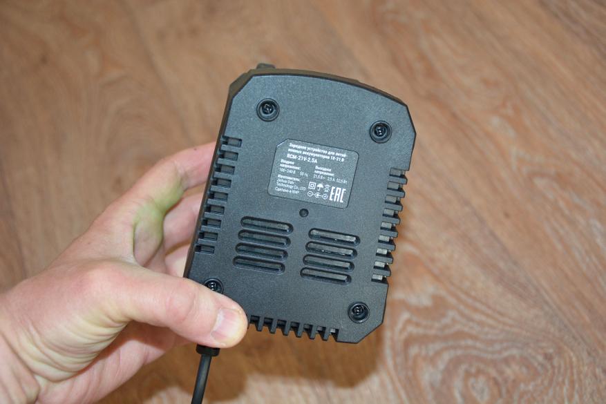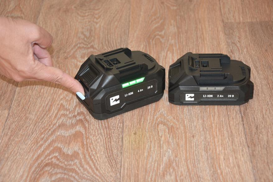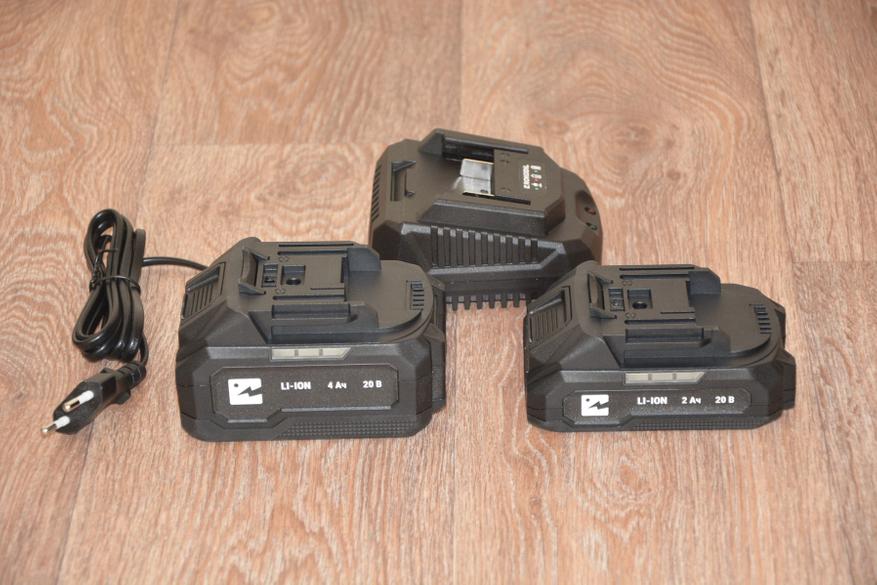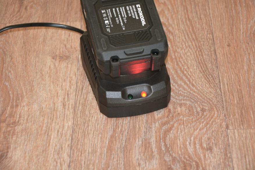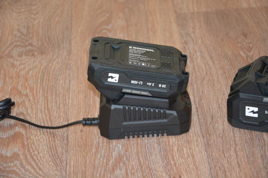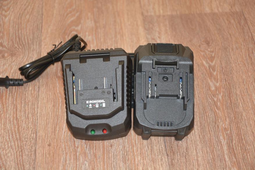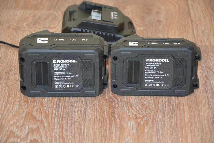 Группа энергоснабжения представлена двумя аккумуляторами в крепких корпусах с индикаторами уровня зарядки и зарядного устройства. Поскольку уже имел дело с аккумуляторной цепной пилой и дрелью-шуруповертом с функцией удара Rokodil, то могу сказать, что аккумуляторы у этого производителя качественные и долгоживущие. Маркировка, собственно RBM-20V-2A и RBM-20V-4A, указана на нижней, прорезиненной части корпусов.