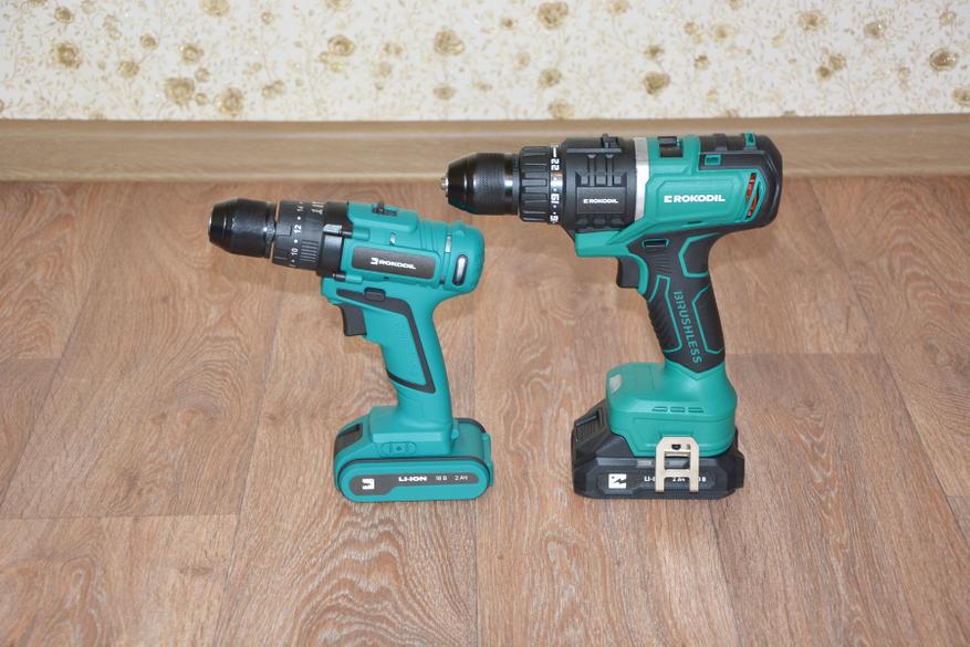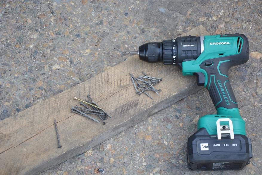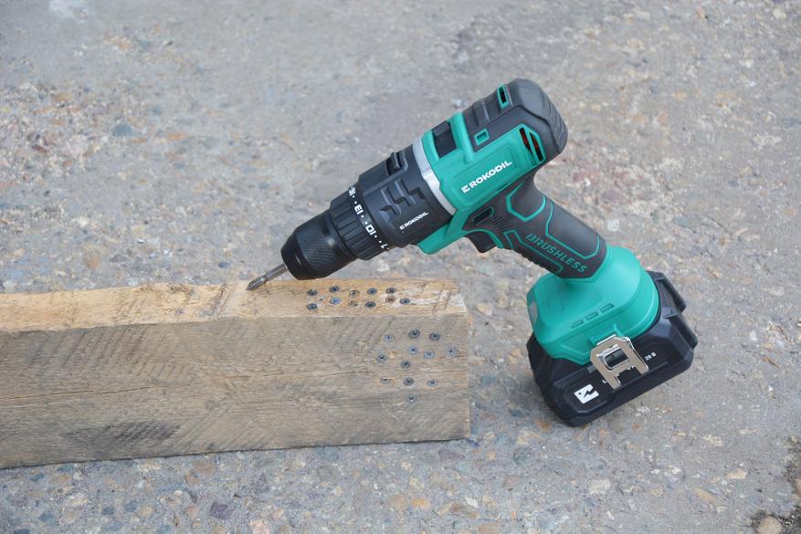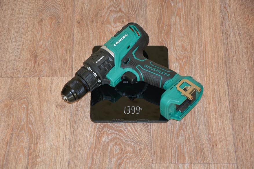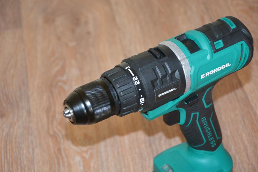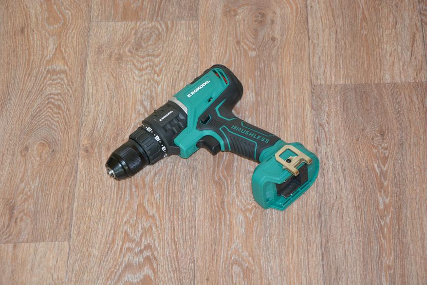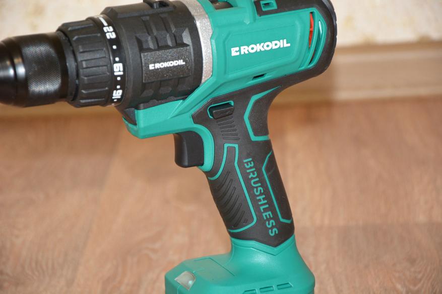 Шуруповерт из коробки на первый взгляд ничем не отличается от обычного — кнопка пуска двигателя с плавной регулировкой оборотов, кнопка реверса и блокировки вала, обрезиненная рукоятка, быстрозажимной патрон под максимальный диаметр сверла 13 мм. Для удобства подвешивания на поясе во время работы есть скоба, которую при необходимости можно снять. Вес инструмента в таком виде — 1,4 кг, плюс аккумулятор на 4А*ч, и получаем почти 2 кг. Если сравнить с дрелью-шуруповертом с функцией удара Rokodil Twist 2 Pro Impact, то разница видна издалека, и, следовательно, потенциал у Rokodil Multivert Start при бесщеточном двигателе мощностью 700 Вт куда выше.