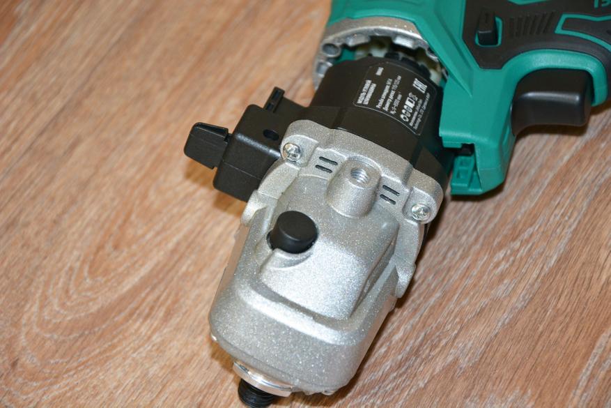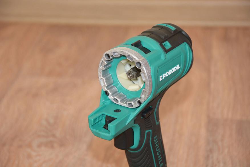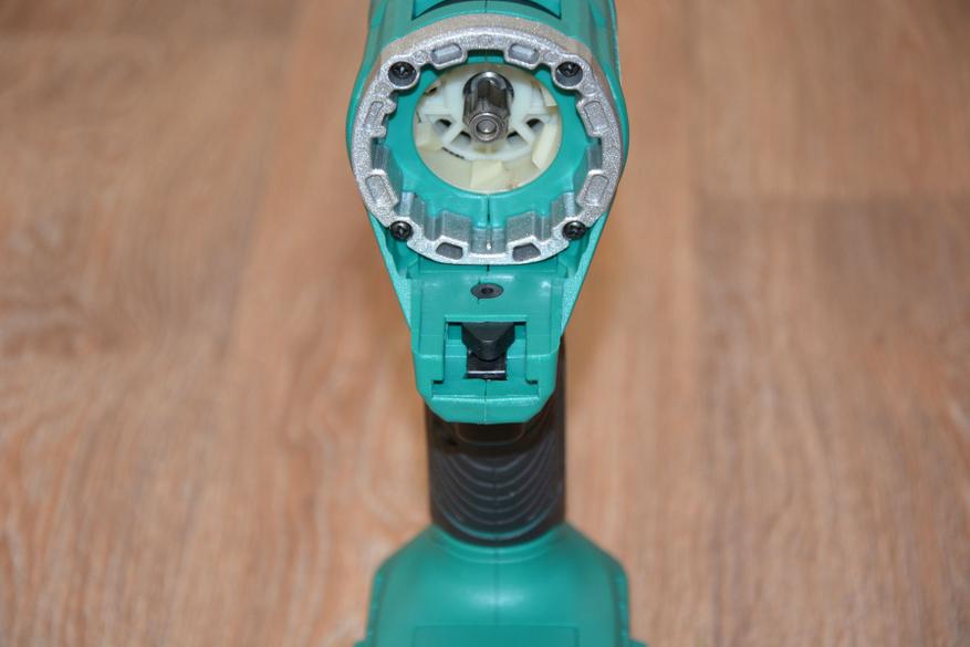 Интерфейс крепления модулей имеет сложный рельеф во избежание проворачивания модулей, ведь скорость вращения двигателя достигает 21 тыс. об/мин. Вращательный момент передается через зубчатую муфту, одна часть которой надета на вал двигателя. Как видим, тут никакого пластика — металл. Механизм фиксации модулей расположен в нижней части интерфейса и связан с кнопкой реверса. Точнее, когда установлен модуль дрели, то реверс работает, когда модуль лобзика или болгарки, то кнопка реверса автоматически уходит влево и блокируется — переключить направление вращения не выйдет. То есть, еще один вид защиты.