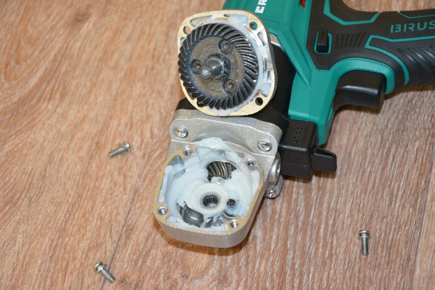 Вентиляционные отверстия редуктора не назвать большими, но их вполне достаточно, как показало дальнейшее использование мультиверта в качестве шлифмашинки — редуктор греется не существенно. То, что в редукторе имеется смазка, не сомневался еще на этапе первичного осмотра — немного смазки вылезло на корпус редуктора при установке крышки. Вскрытие показало, что внутрь смазки положили щедро.