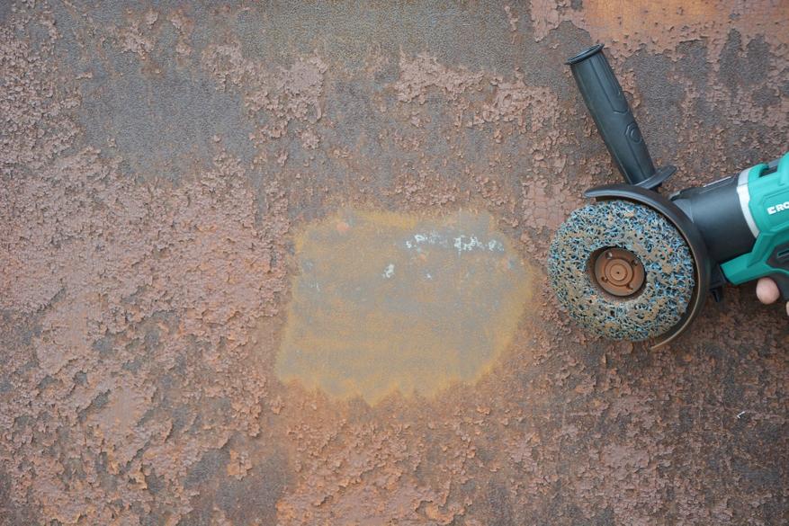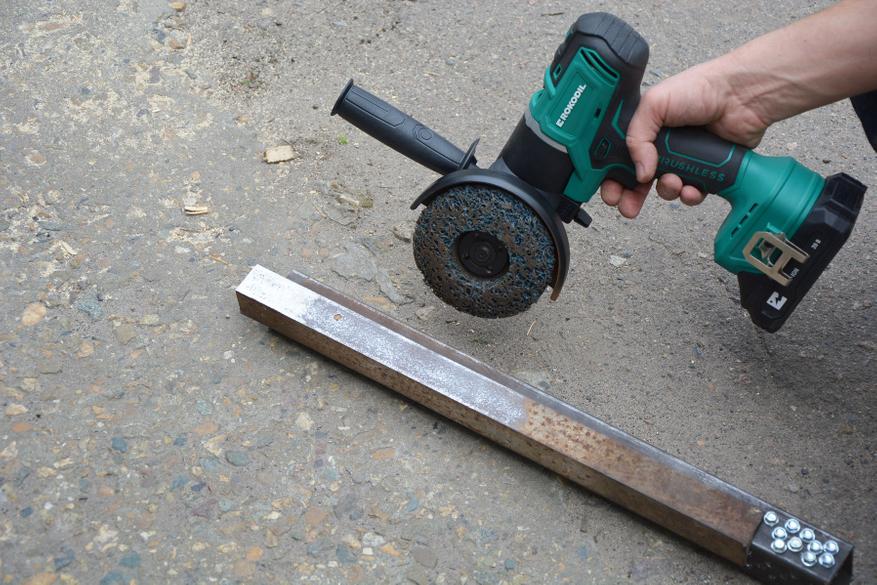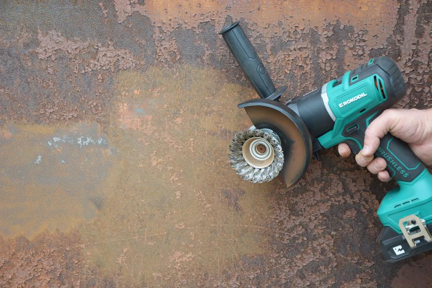 Первыми в дело пошли зачистной диск и «коралл». С ржавчиной оба справляются хорошо. Остатки старой краски со ржавого листа металла также снимаются без проблем. При чрезмерном нажиме чувствуется небольшая потеря мощности, но это есть и у сетевых, более мощных болгарок. В данном же случае мы не привязаны к сети, а очистку металла можем производить хоть в поле, модель свою работу выполняет.