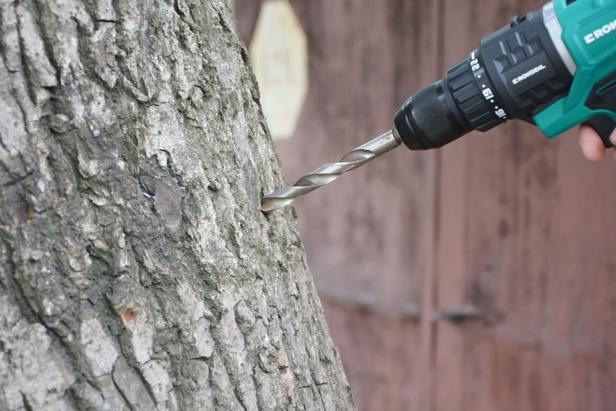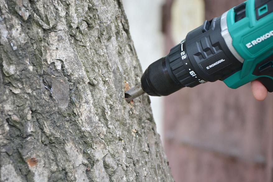 Полевые испытания начал со сверления ствола грецкого ореха сверлом диаметром 13 мм. Хвостовик здесь 10 мм, но и сам патрон модуля Rokodil Multivert Start позволяет устанавливать сверла вплоть до 13 мм. Внешние слои древесины ореха мягкие, дальше идут уже более твердые и вязкие. Однако инструмент без какого-либо существенного нагрева справился в несколькими отверстиями, загоняя сверло на максимальную глубину.