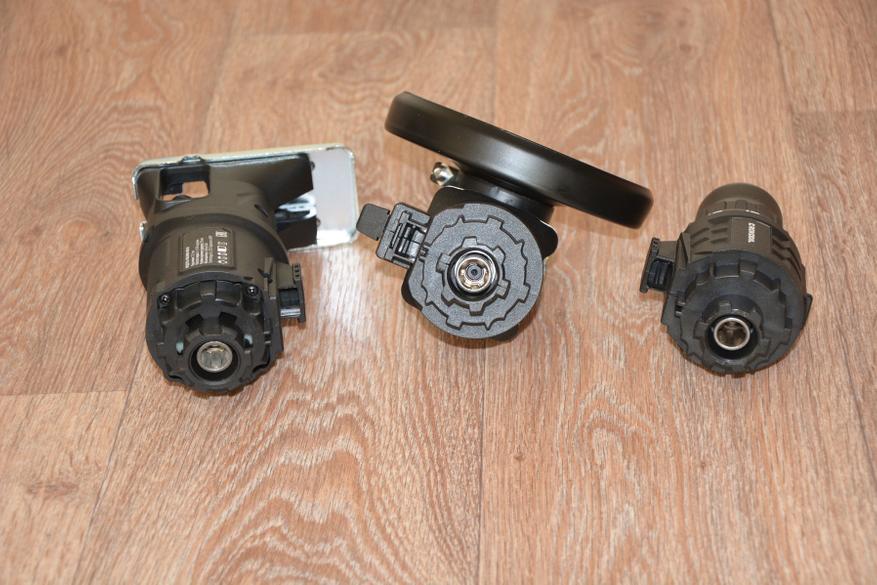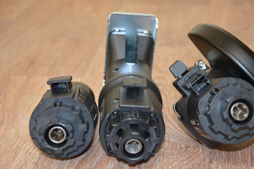 С тыльной стороны ответные части интерфейса, включая металлические части зубчатых муфт. Фиксаторы модулей дрели и лобзика одинаковые, а у болгарки имеют более сложную конструкцию, так как сюда еще интегрировали защиту от случайного пуска.